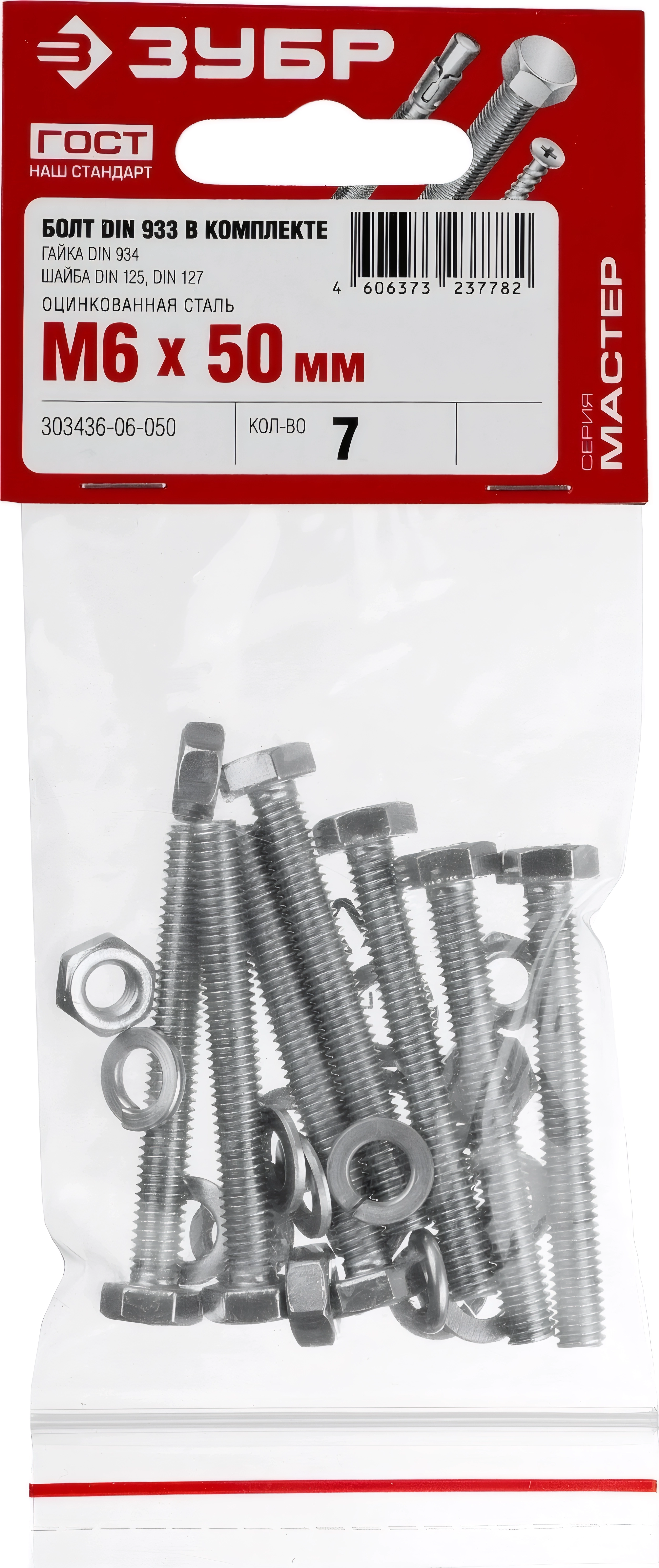 Болт с гайкой и шайбами ЗУБР DIN 933, M6 х 50 мм, цинк, 7 шт