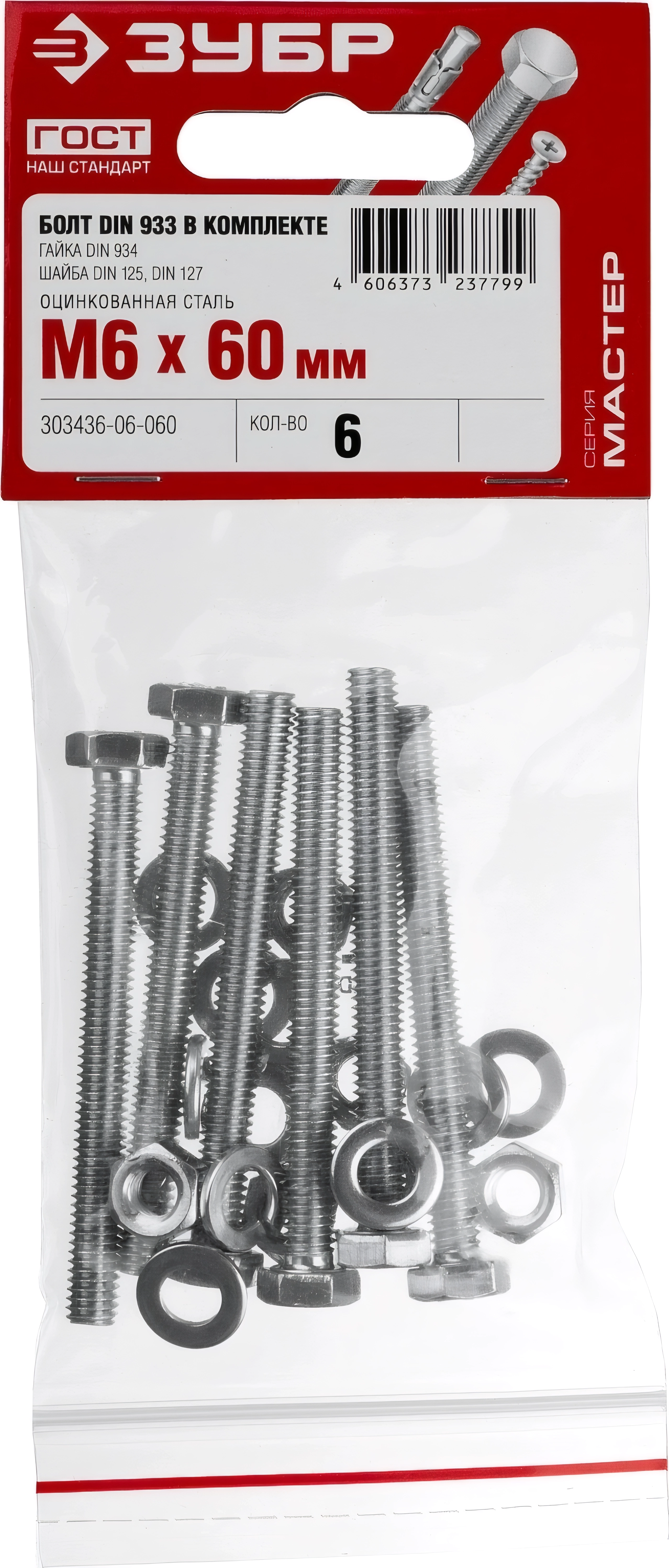 Болт с гайкой и шайбами ЗУБР DIN 933, M6 х 60 мм, цинк, 6 шт