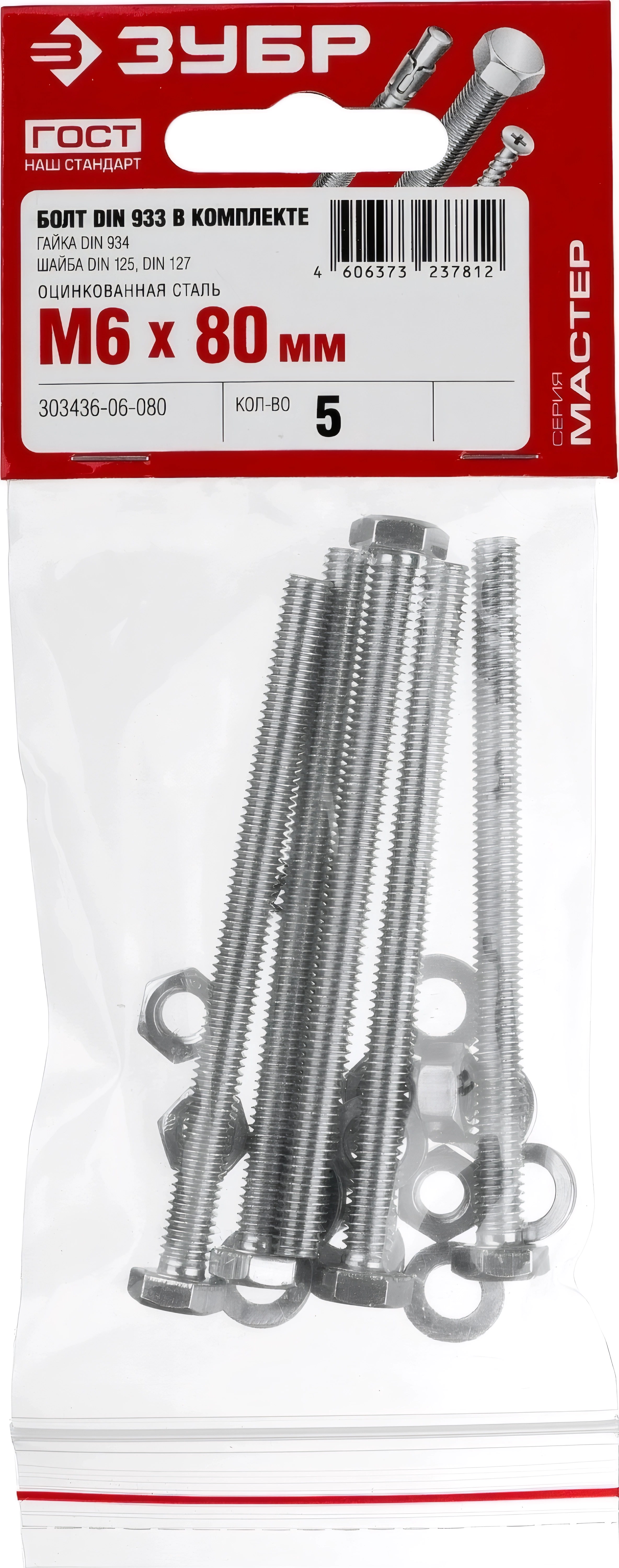 Болт с гайкой и шайбами ЗУБР DIN 933, M6 х 80 мм, цинк, 5 шт