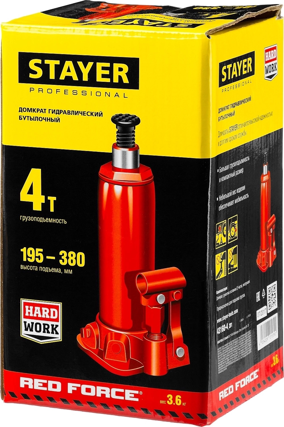 Бутылочный гидравлический домкрат Professional STAYER RED FORCE 4 т 195 - 380 мм