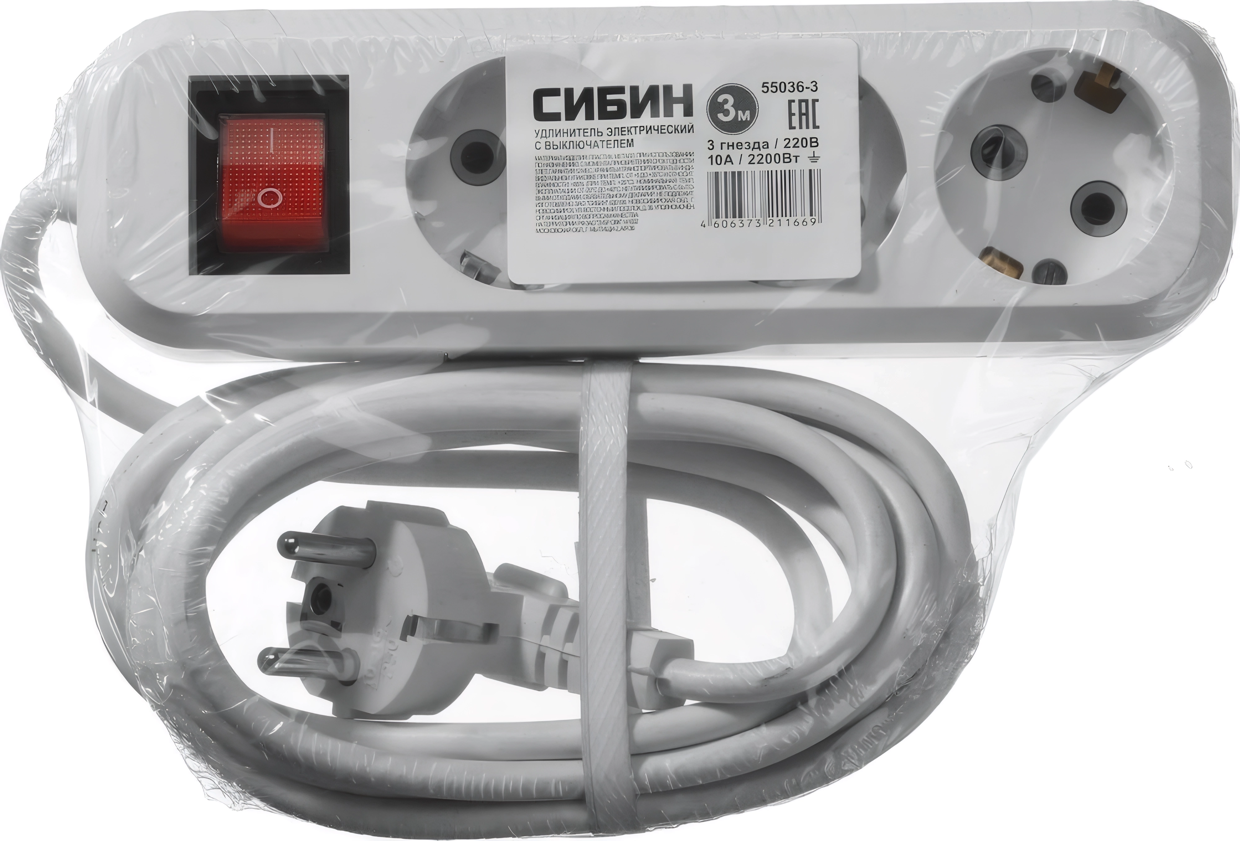 Бытовой удлинитель СИБИН У-30 В, ПВС, 3 х 0.75 мм2, 3 гн., 3 м, выключатель 2200 Вт