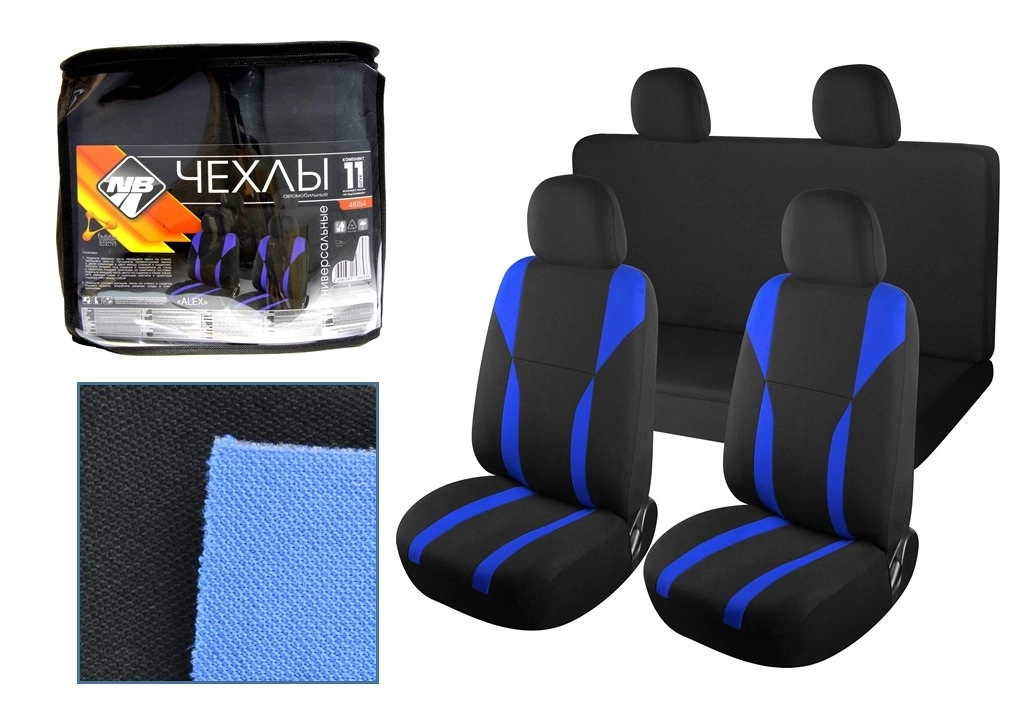 - Комплектация: 11 элементов — чехлы на водительское, пассажирское и заднее сидения, 5 чехлов на подголовники