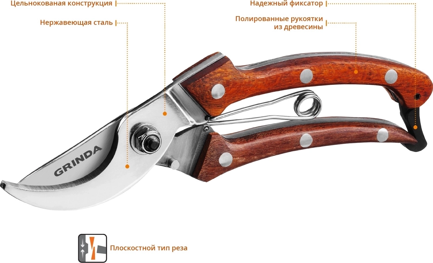 Цельнокованый компактный плоскостной секатор PROLine GRINDA P-17 195 мм из нержавеющей стали с деревянными рукоятками