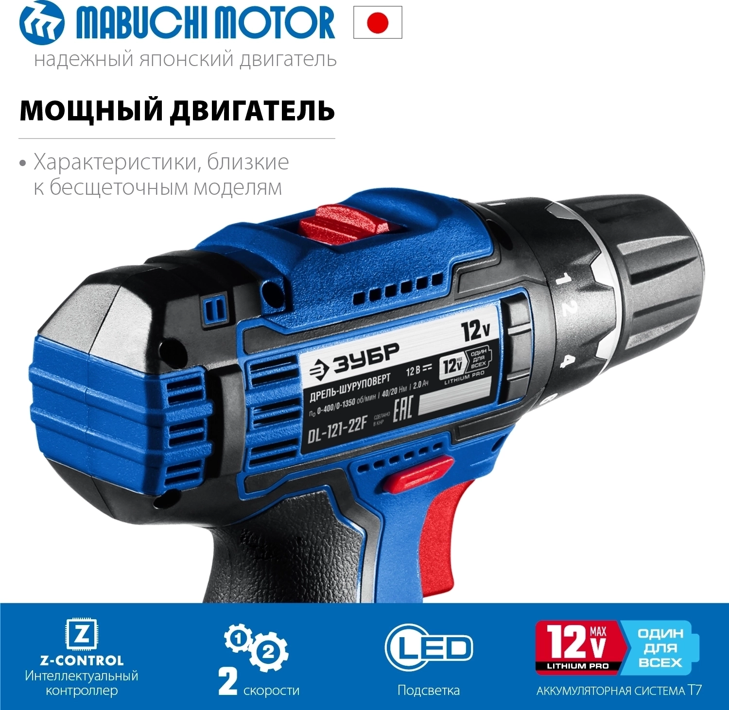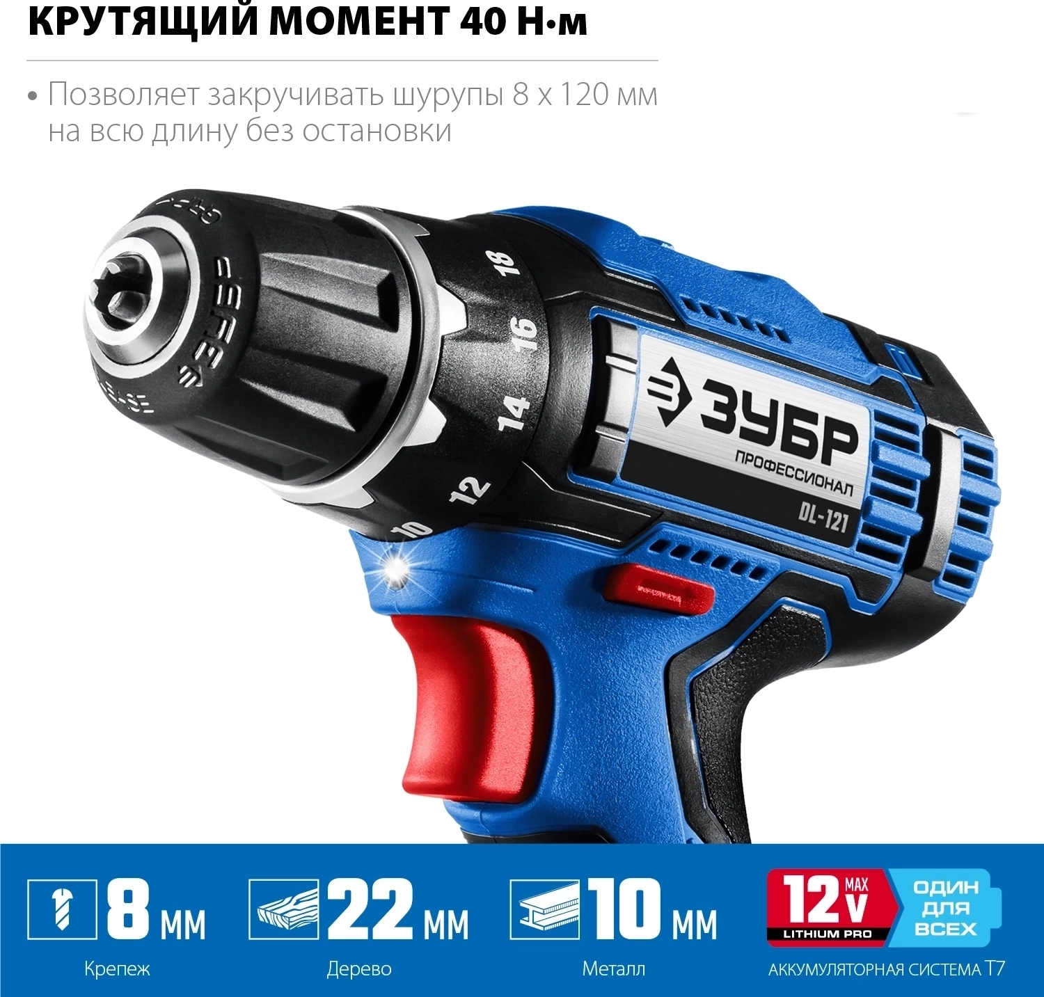 Дрель-шуруповерт + LED фонарь ЗУБР 12 В 40 Н·м 2 АКБ тип Т7 2 А·ч кейс