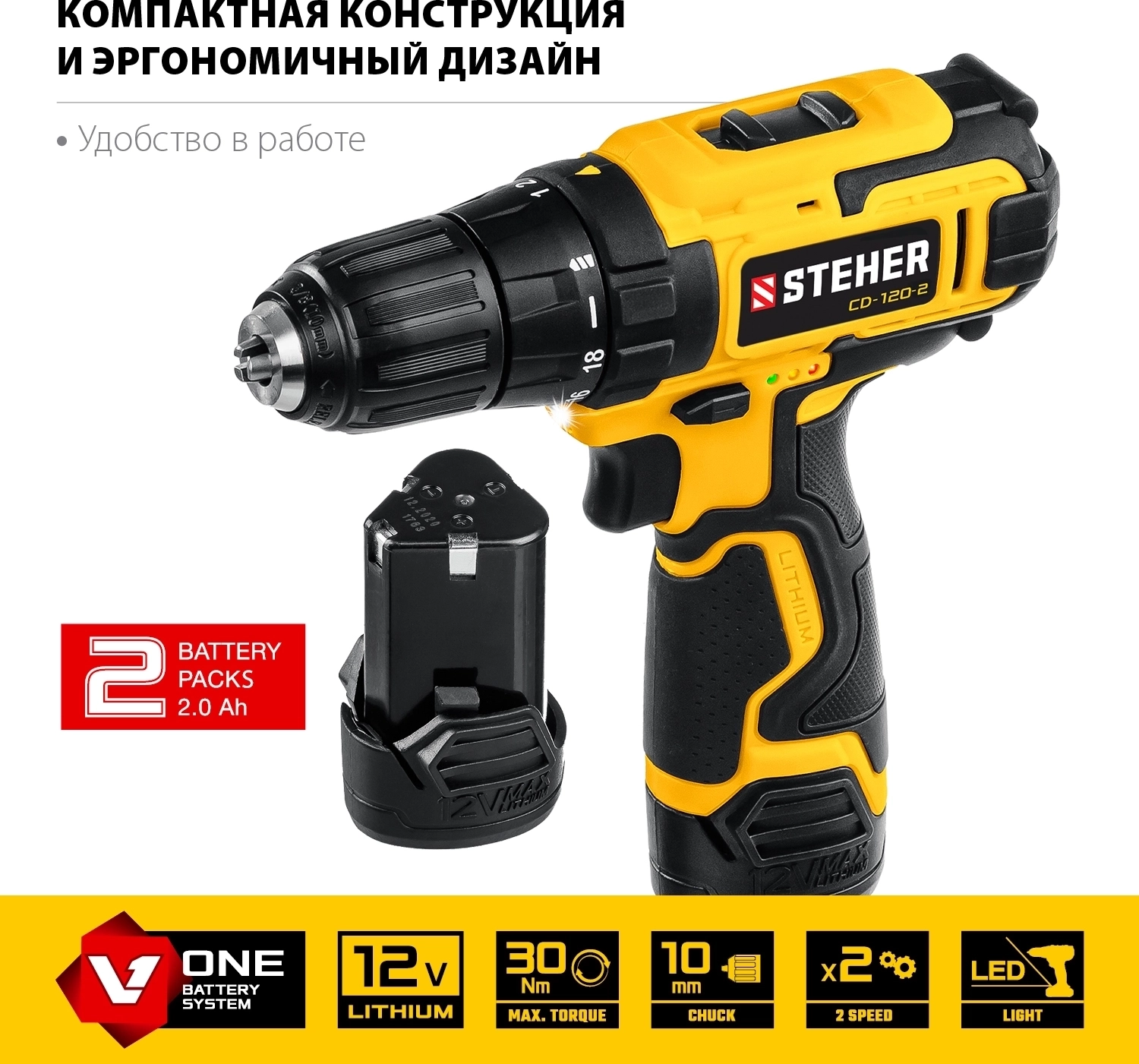 Новый недорогой шуруповерт Steher - помощник в сверлении и заворачивании. Индивидуальный дизайн, удобная эргономика, высокие скорость и крутящий момент обеспечивают комфортную и производительную работу. ″Мягкая″ муфта с минимальным крутящим моментом 0.2 Нм позволяет работать с компьютерными винтиками или мебельной отделкой