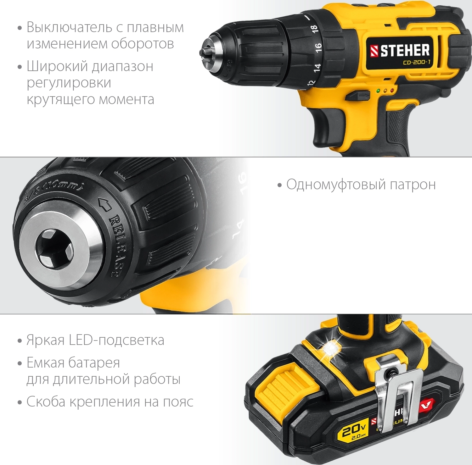 Новый недорогой шуруповерт Steher - помощник в сверлении и заворачивании. Индивидуальный дизайн, удобная эргономика, высокие скорость и крутящий момент обеспечивают комфортную и производительную работу. ″Мягкая″ муфта с минимальным крутящим моментом 0.2 Нм позволяет работать с компьютерными винтиками или мебельной отделкой