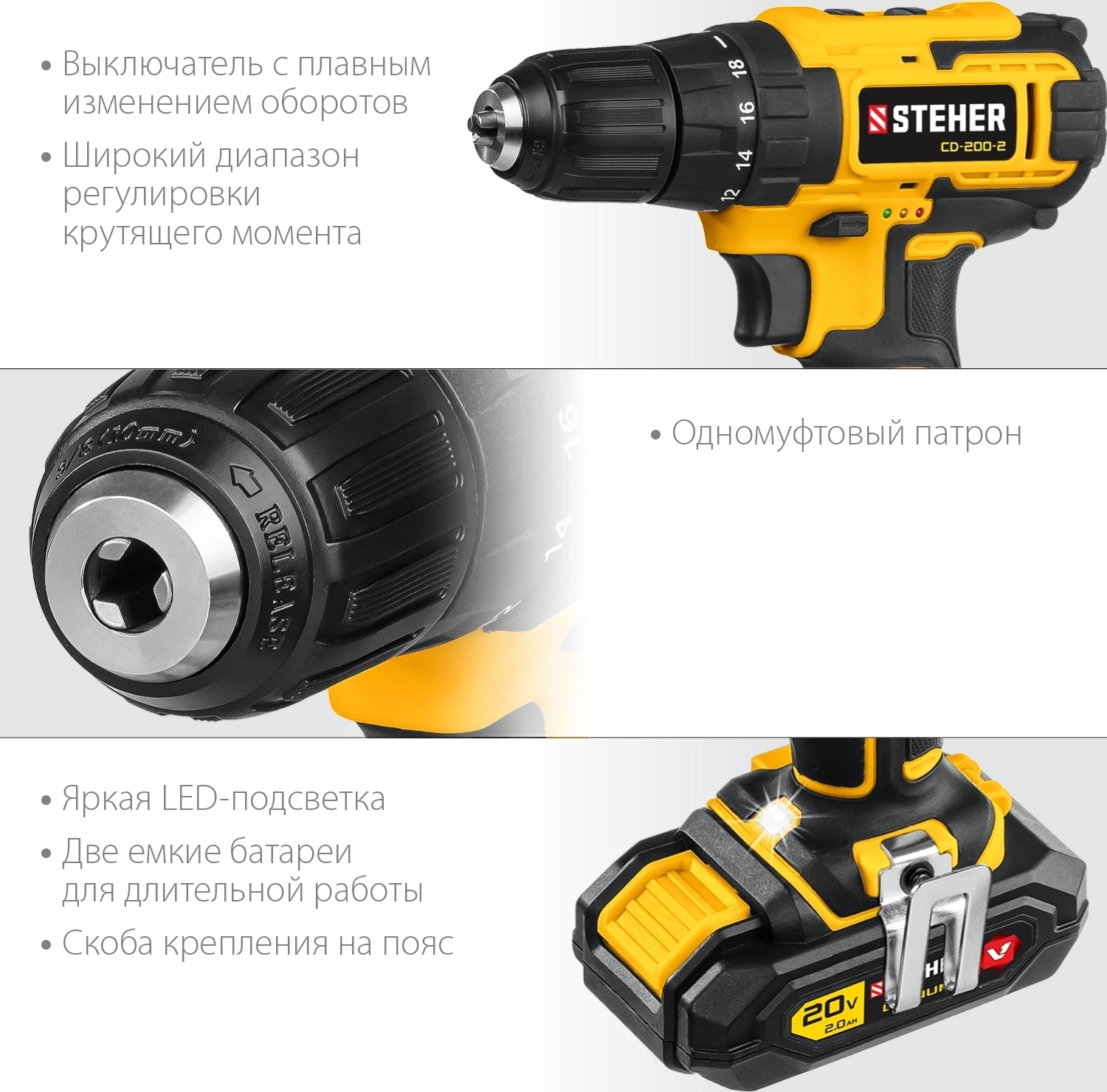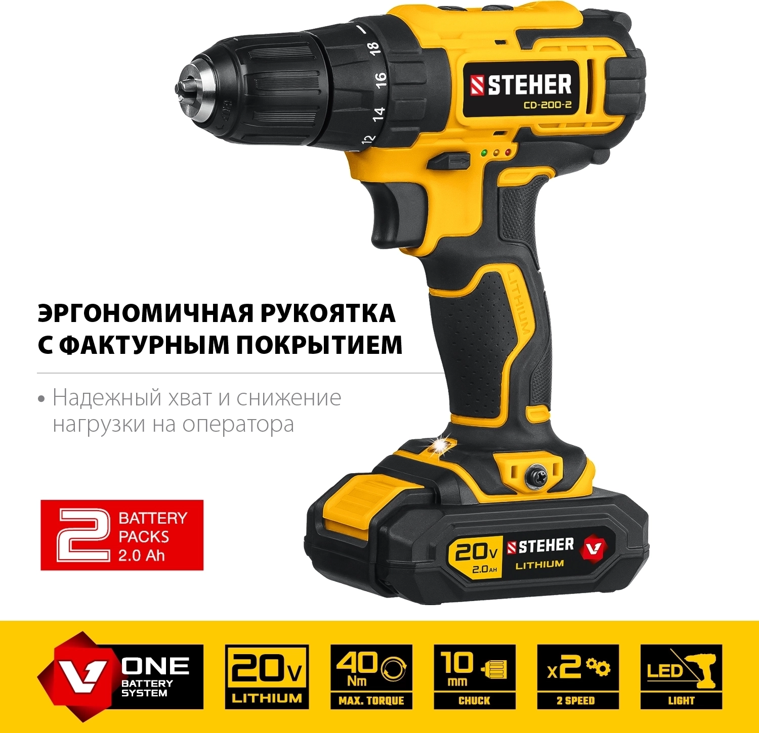 Дрель-шуруповерт STEHER V1 20 В 40 Н·м 2 АКБ 2 А·ч