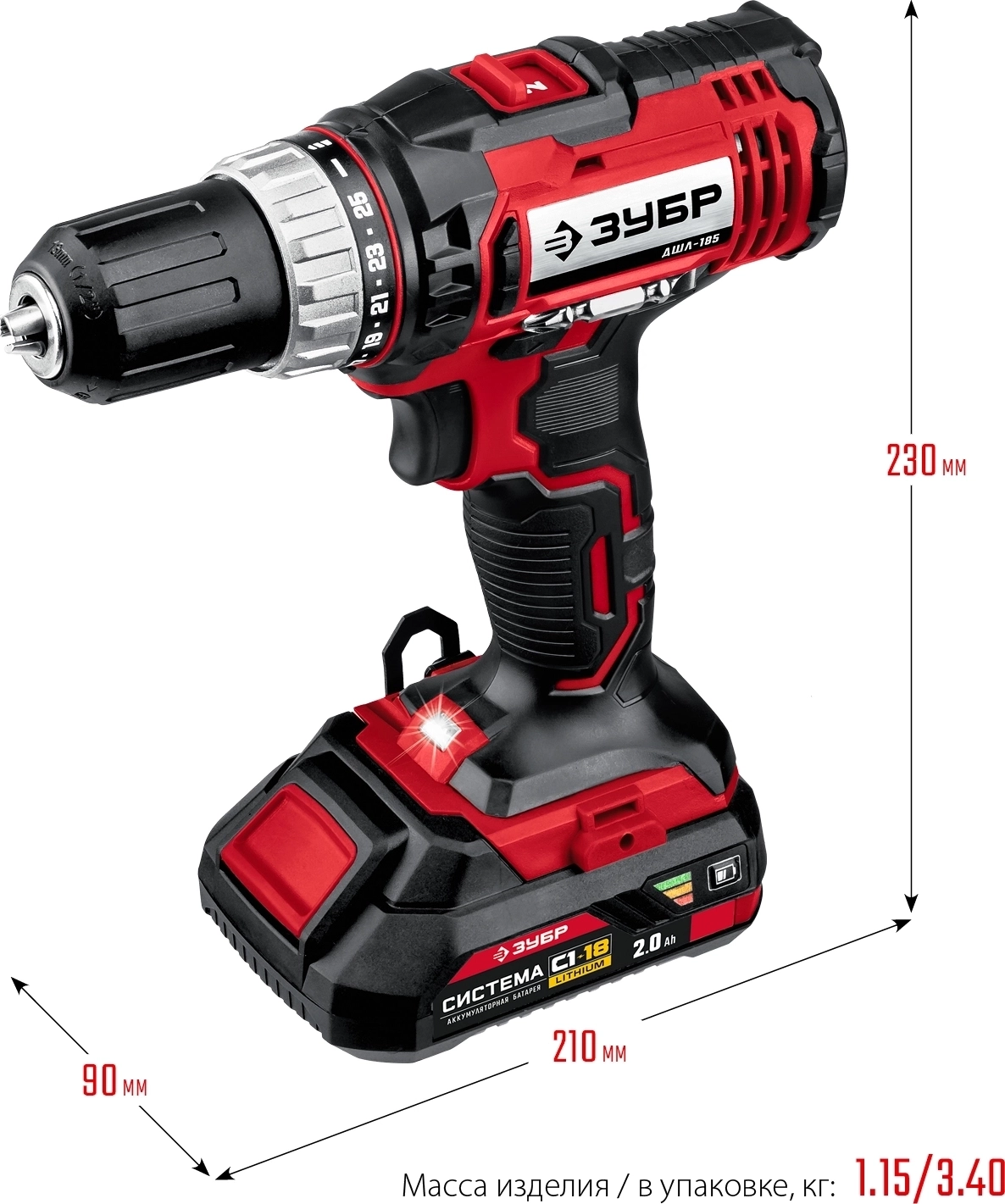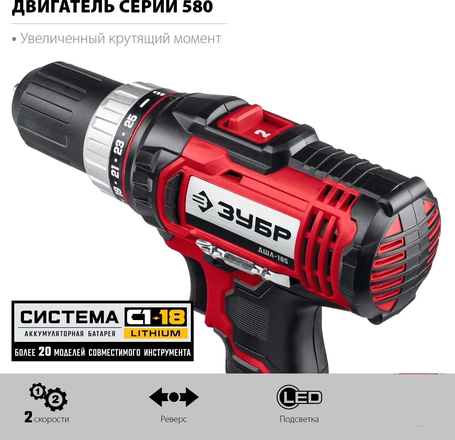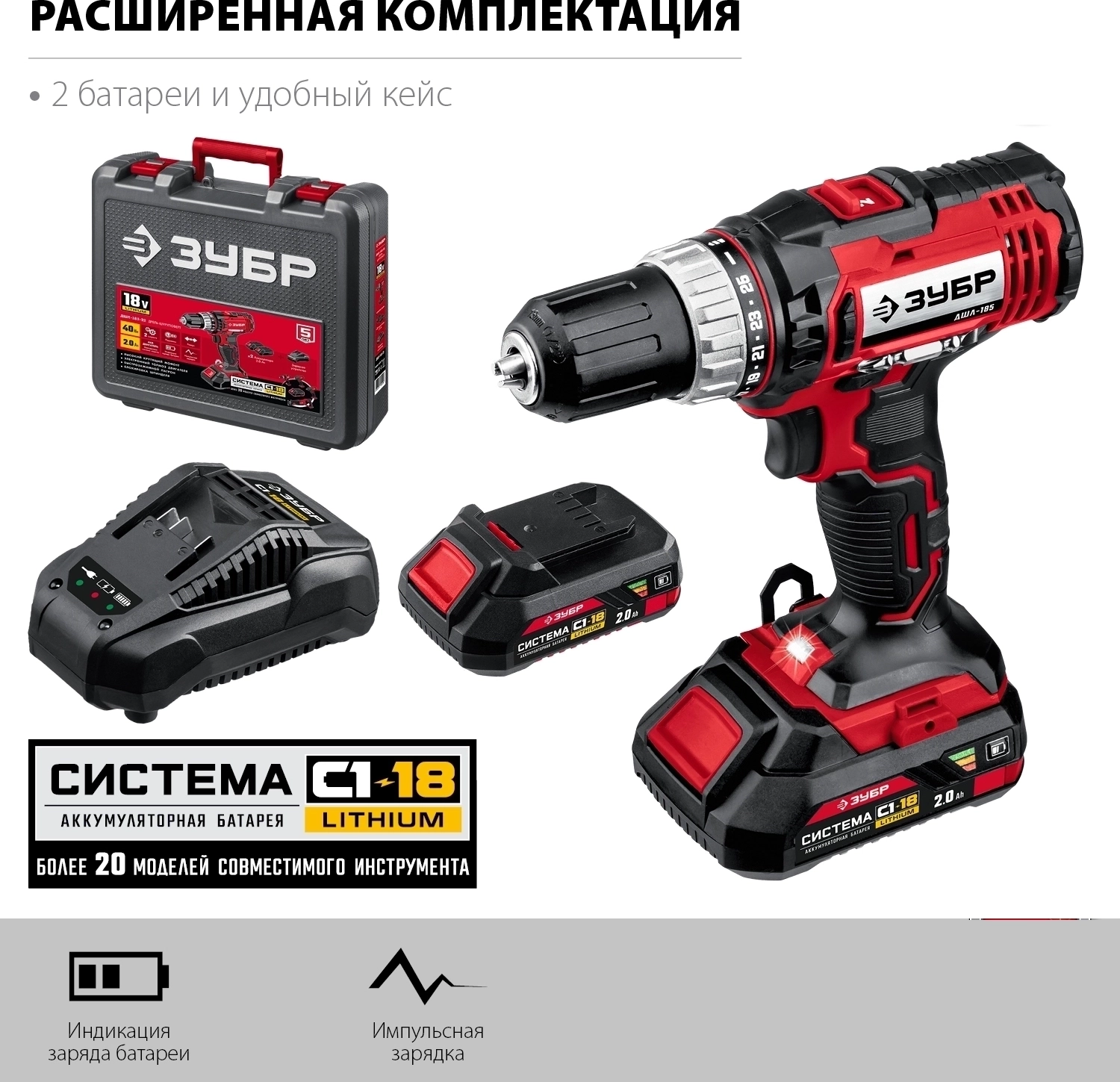 Дрель-шуруповерт ЗУБР С1-18 18 В 40 Н·м 2 АКБ 2 А·ч