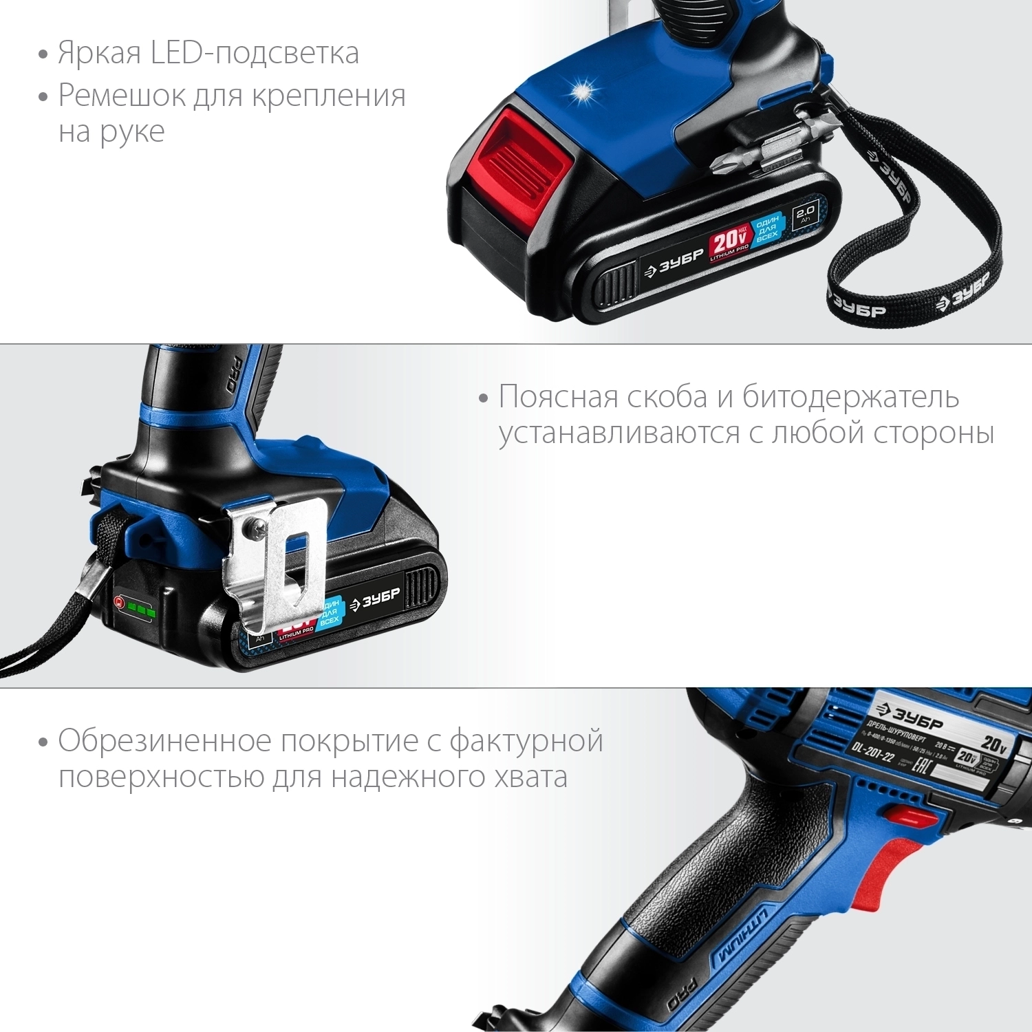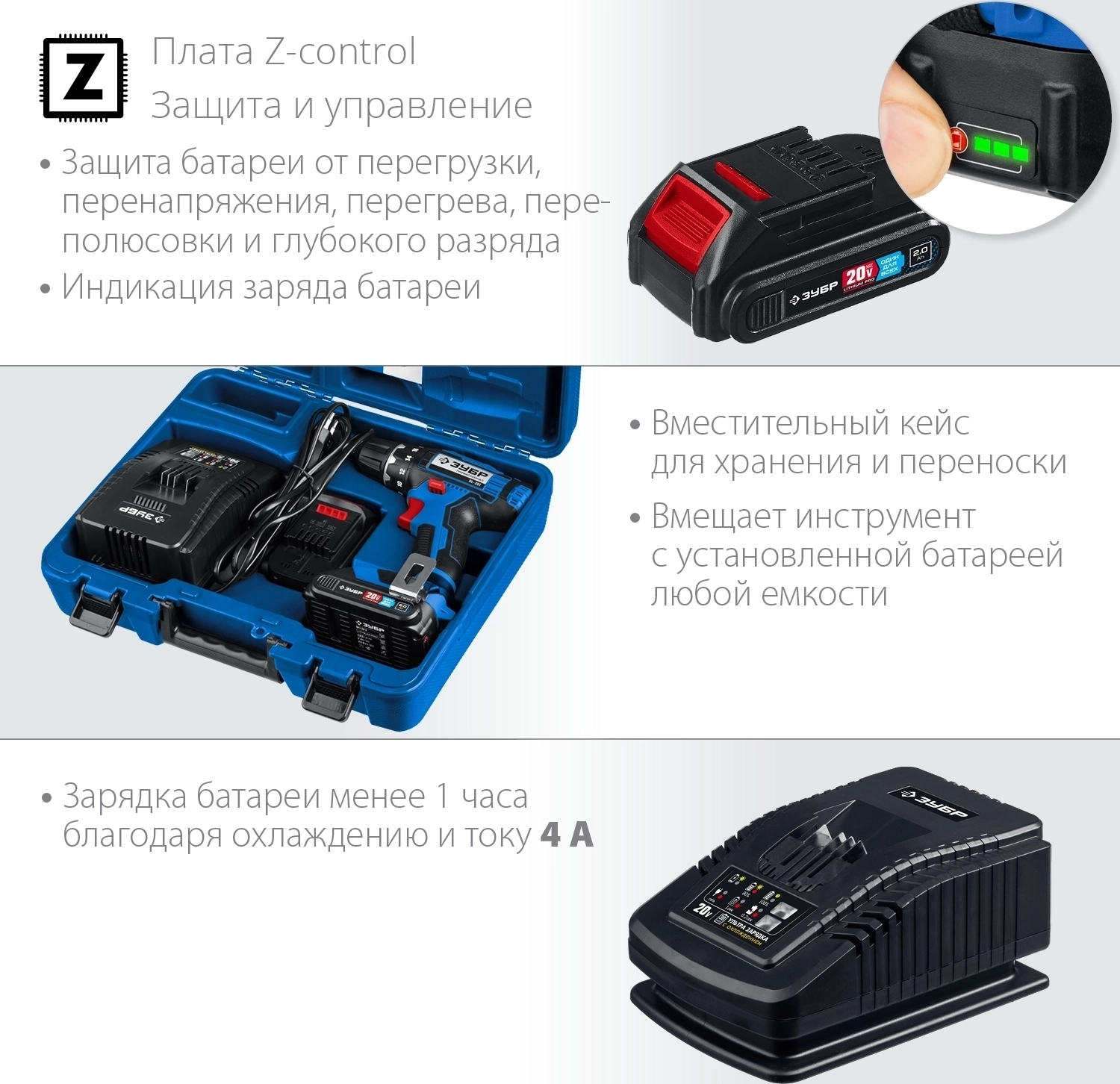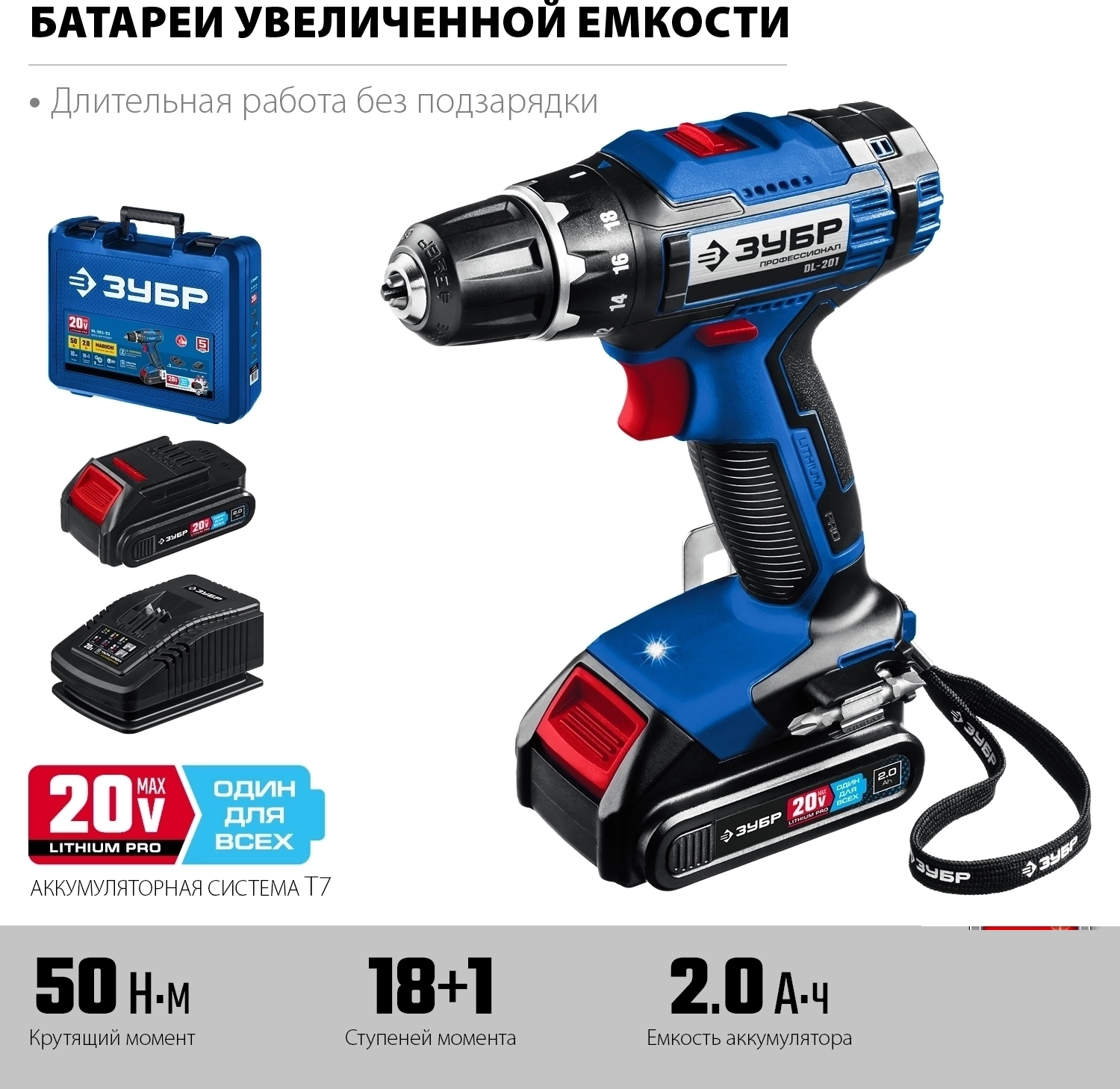 Дрель-шуруповерт ЗУБР Т7 20 В 50 Н·м 2 АКБ 2 А·ч кейс