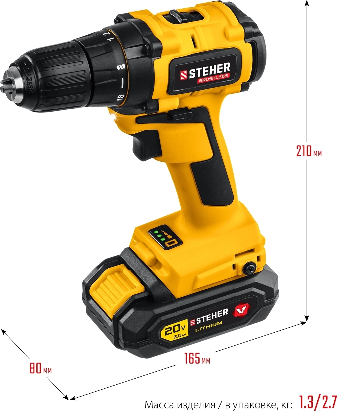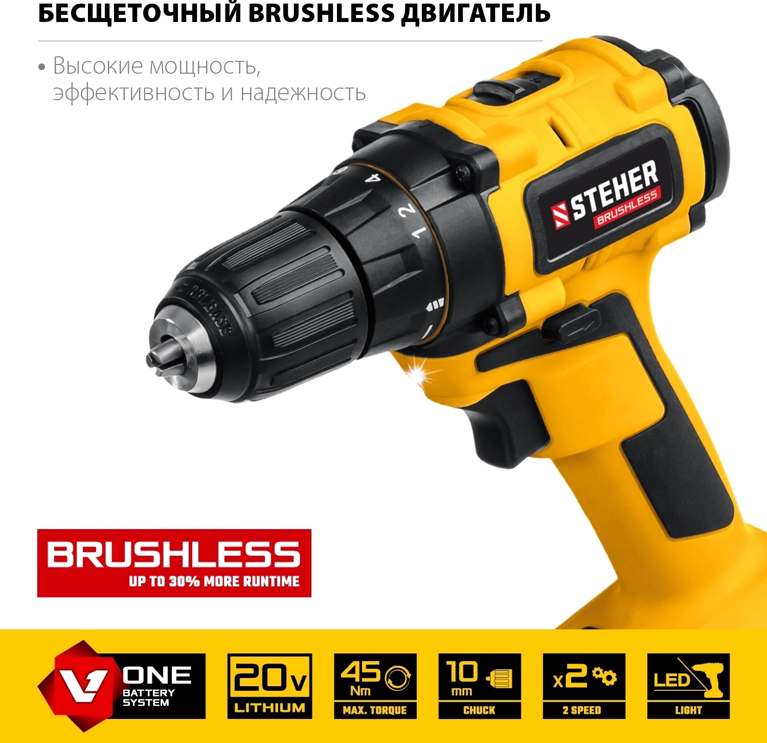 Дрель-шуруповерт бесщеточная STEHER V1 20 В 45 Н·м 1 АКБ 2 А·ч