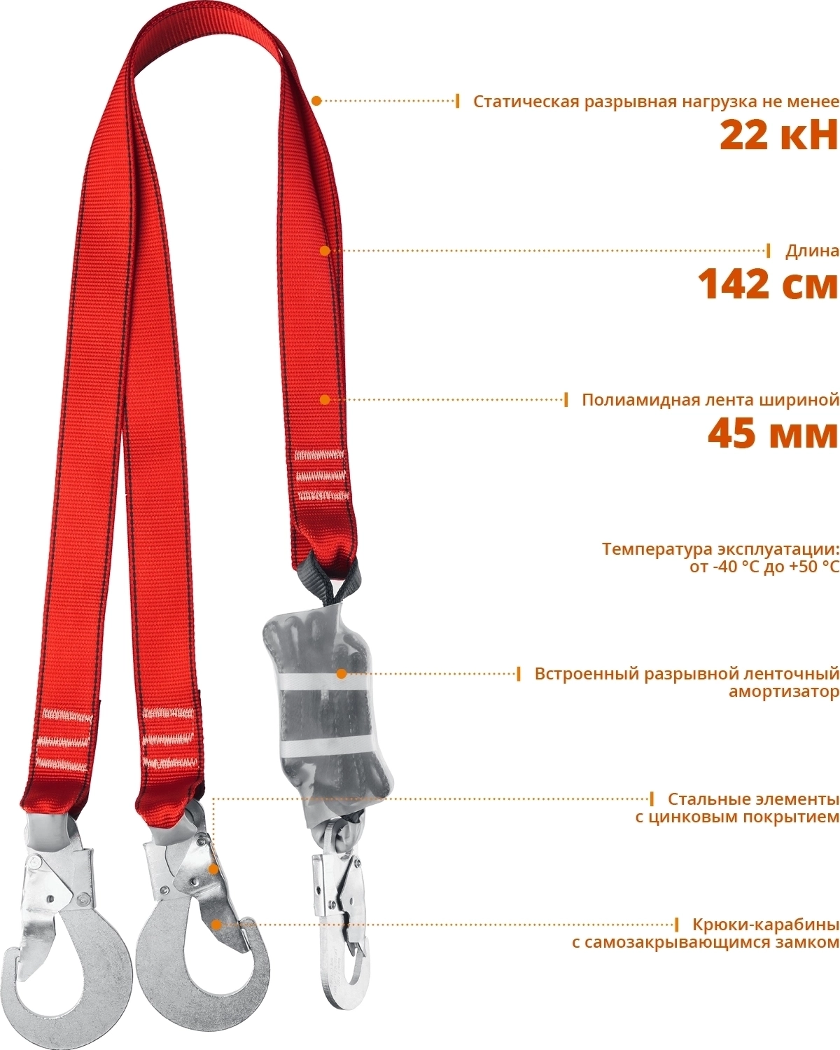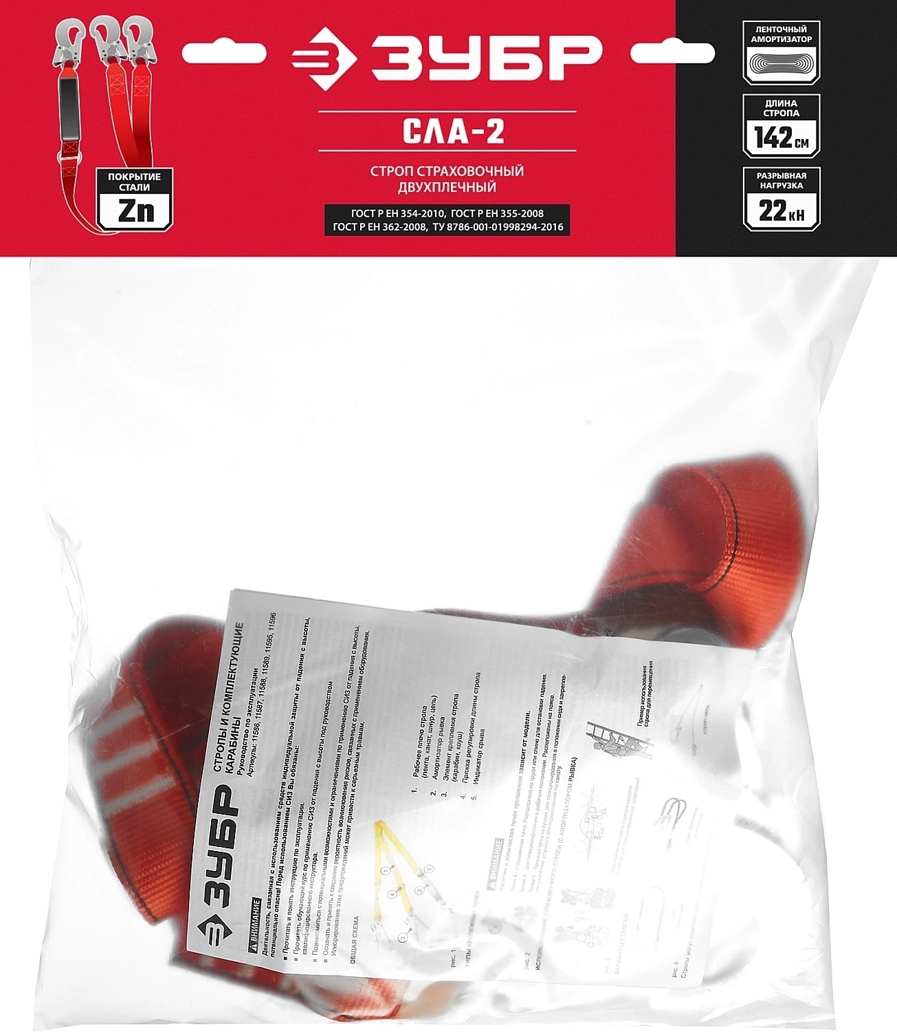 Двухплечный строп ЗУБР СЛА-2 карабины из оцинкованной стали, длина - 1.42м, разрывной ленточный амортизатор