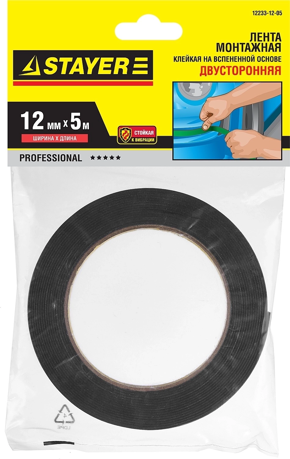 Двухсторонняя клейкая лента Professional STAYER 12 мм 5 м черная на вспененной основе