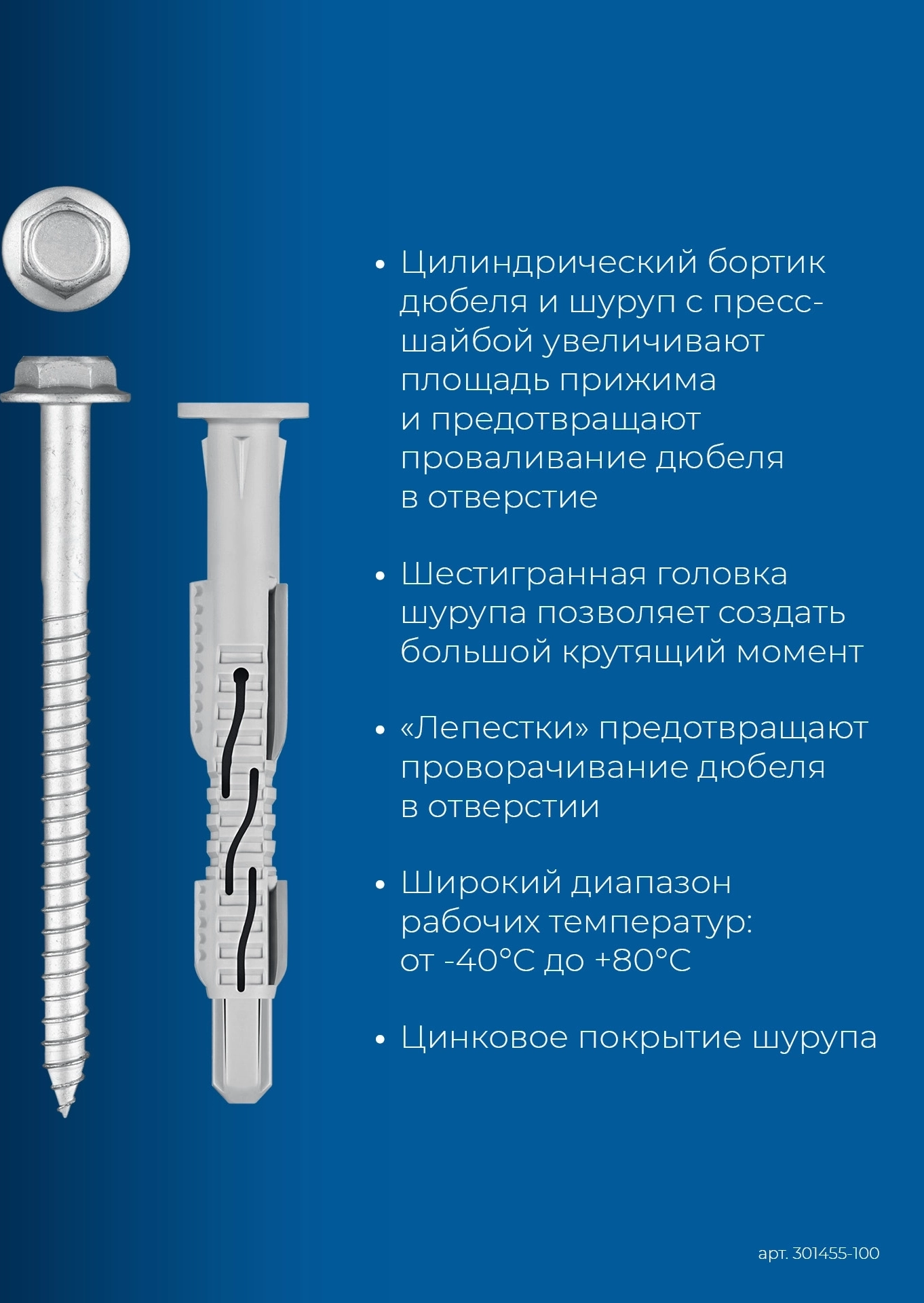 - Специально разработанные ″лепестки″ предотвращают проворачивание установленного дюбеля в отверстии.