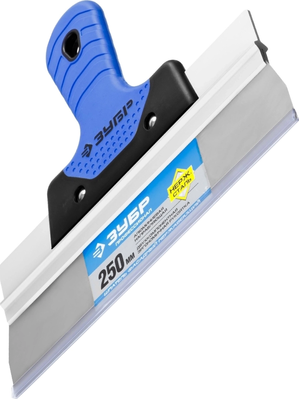 Фасадный шпатель нержавеющий ЗУБР 250 мм усиленная алюминиевая направляющая двухкомпонентная ручка