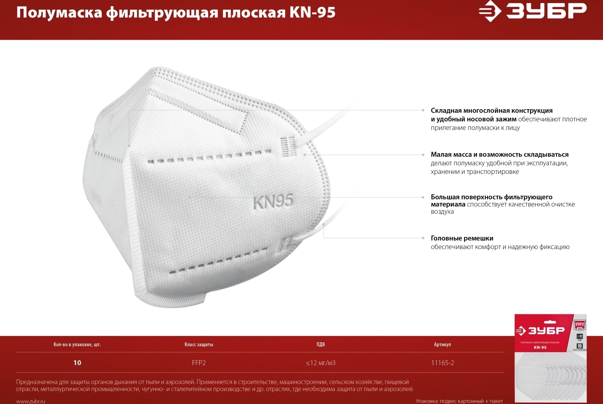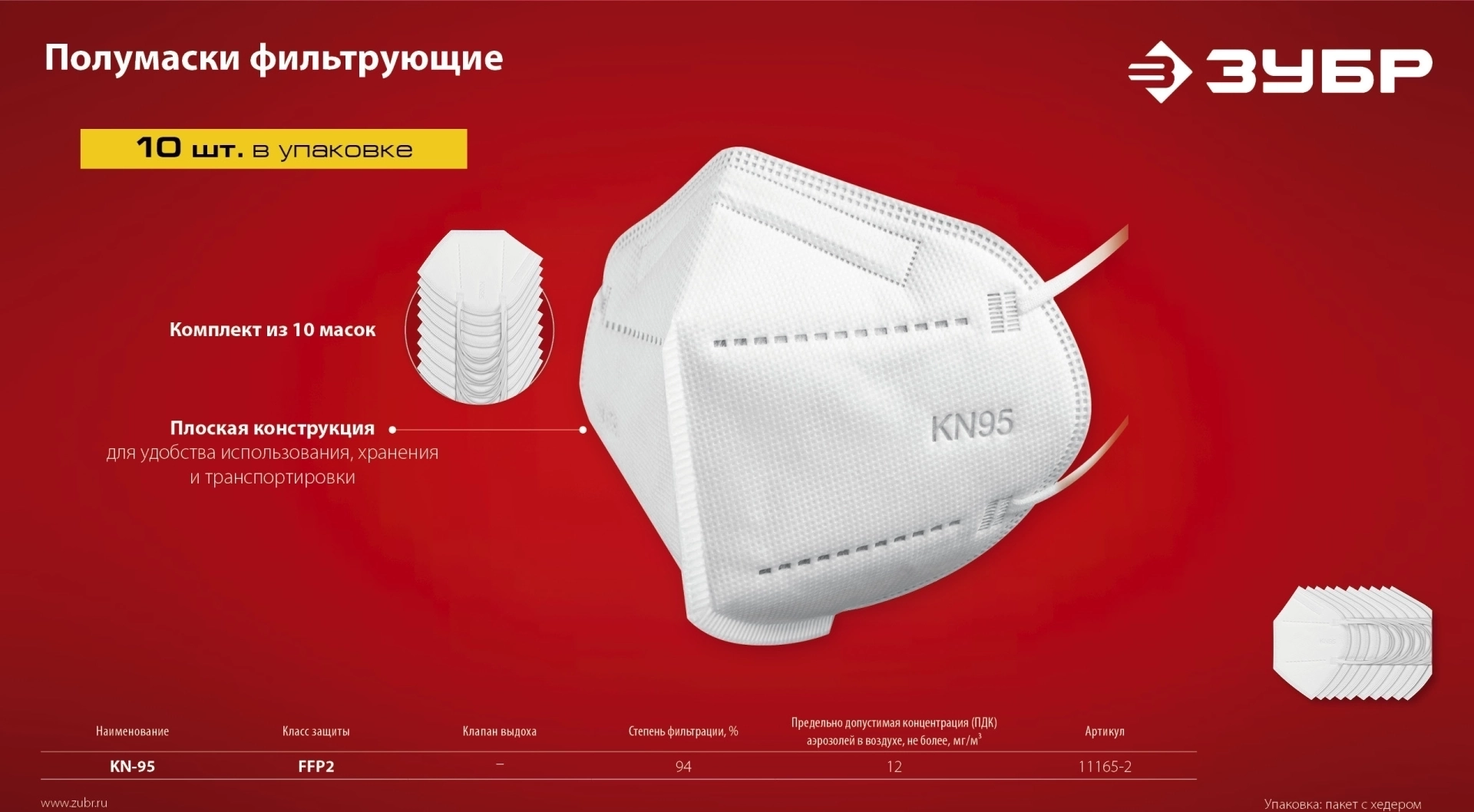 Фильтрующая полумаска ЗУБР KN-95, класс защиты FFP2, 10 шт