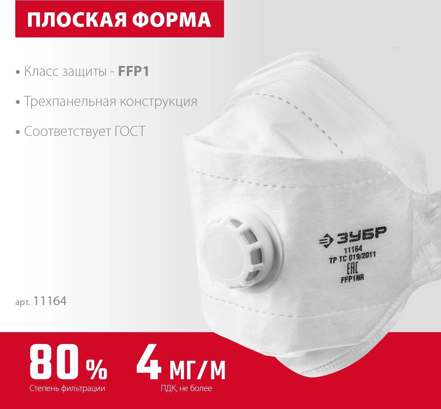 Фильтрующая полумаска с клапаном выдоха ЗУБР ТК-80, класс защиты FFP1, плоская 3-х панельная