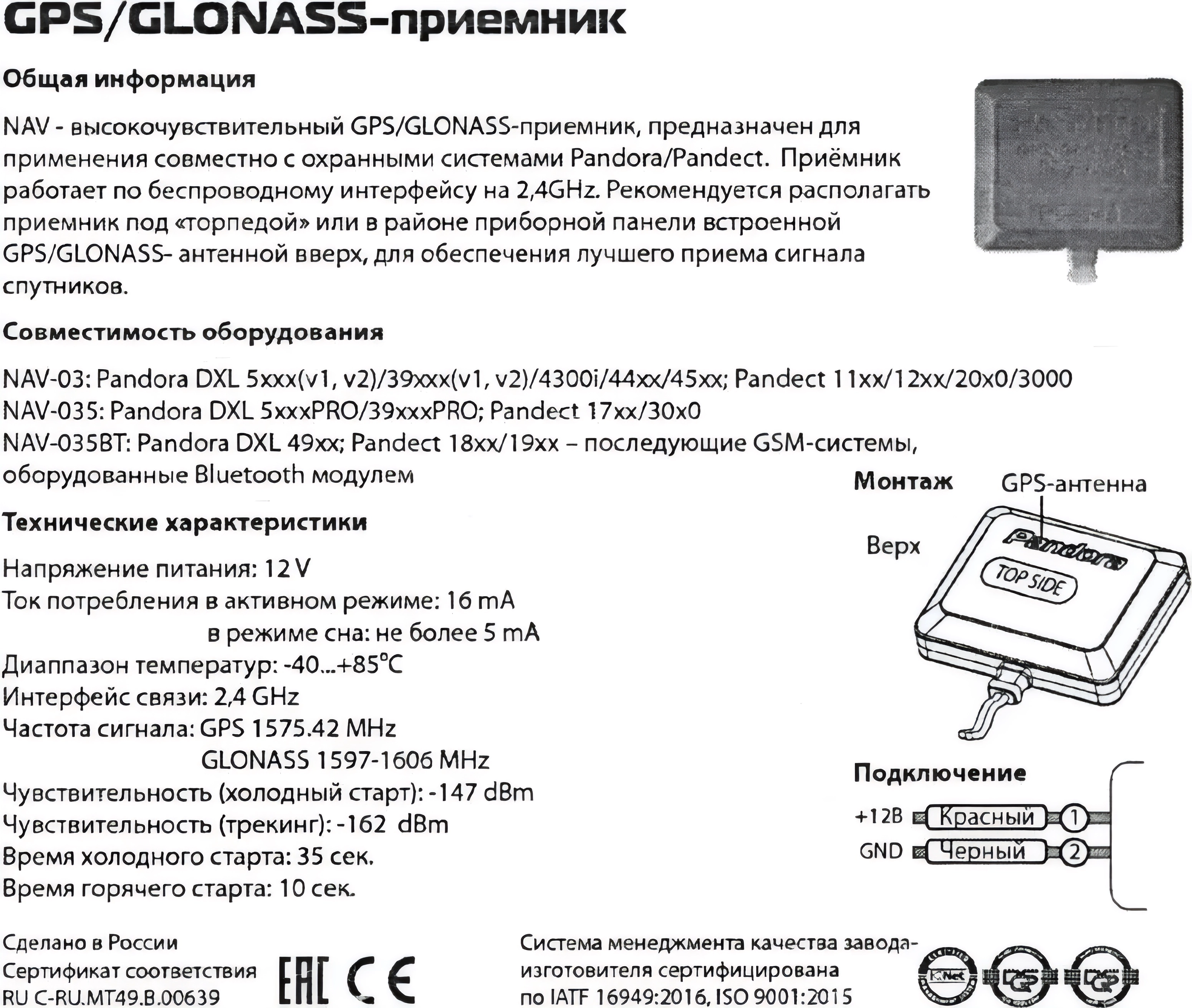 Pandora NAV-035 - это GPS/GLONASS-приемник, позволяющий определять местонахождение автомобиля и передавать сообщения с указанием точных координат в экстренных ситуациях. Данный приемник сконструирован специально для использования совместно с сигнализациями Pandora: DXL 5000 Pro v2, DXL 3945 Pro, DXL 3910 Pro, DXL 3970 Pro v2.