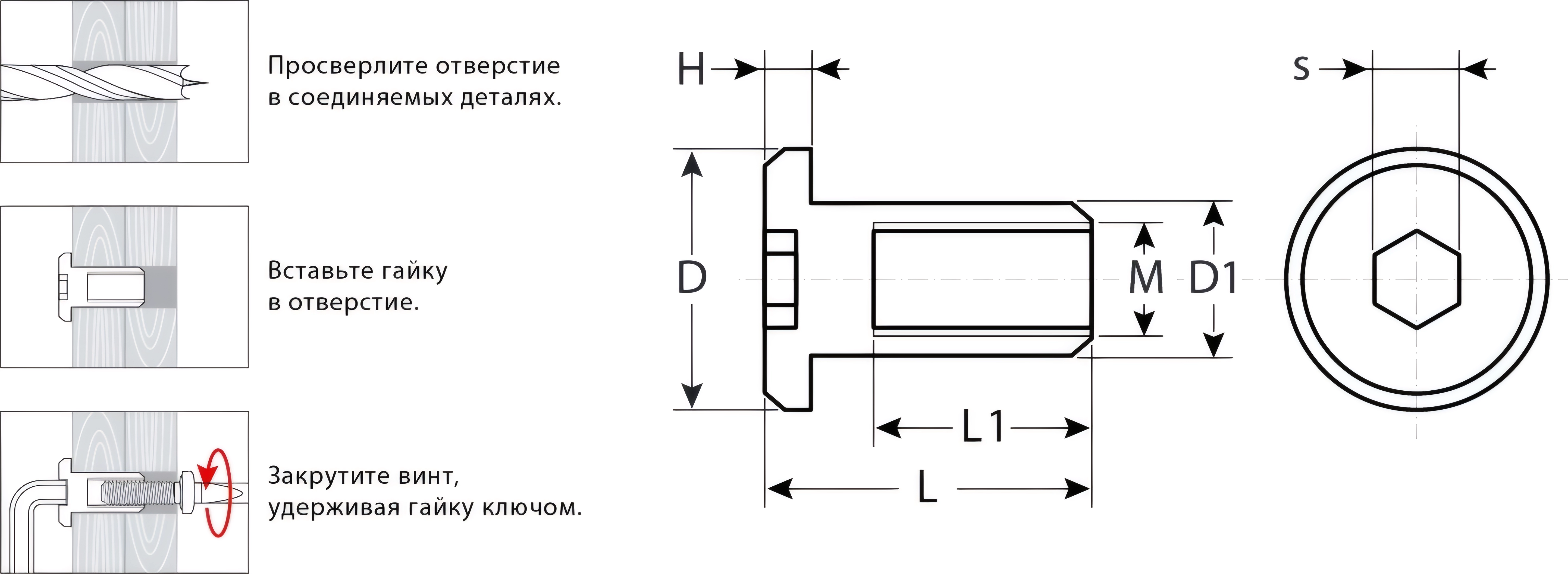 Для создания разъемного резьбового соединения в мебельном производстве, стяжки деталей и конструкций. Гайка устанавливается в заранее подготовленное отверстие, равное или чуть больше внешнего диаметра гайки. Фиксация гайки происходит при помощи винта с метрической резьбой. Для затягивания соединения используется торцевой шестигранный ключ.