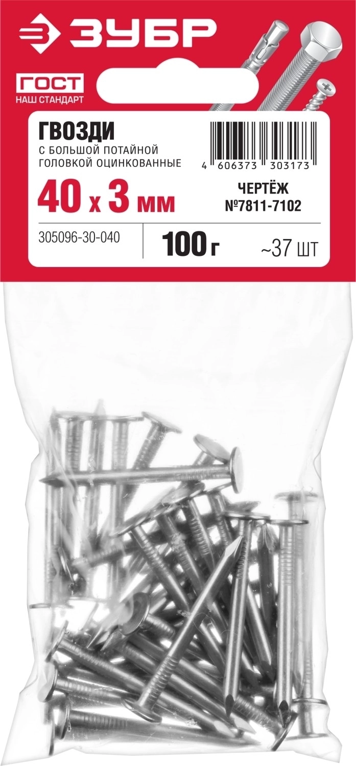 Гвозди с большой потайной головкой ЗУБР 40 x 3 мм, цинк, 100 г