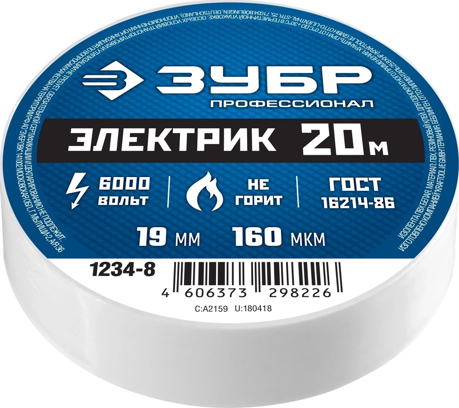 Изолента ПВХ ЗУБР ЭЛЕКТРИК-20 19 мм х 20 м 6 000 В белая