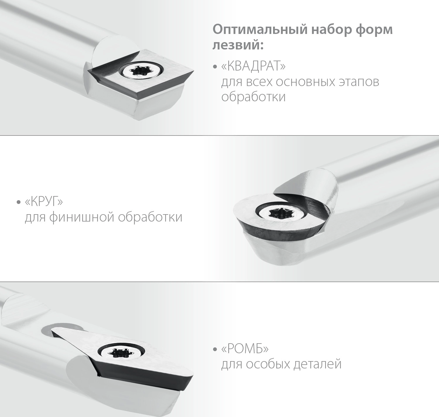- Универсальность использования благодаря лезвиям круглой, квадратной и ромбической формы
