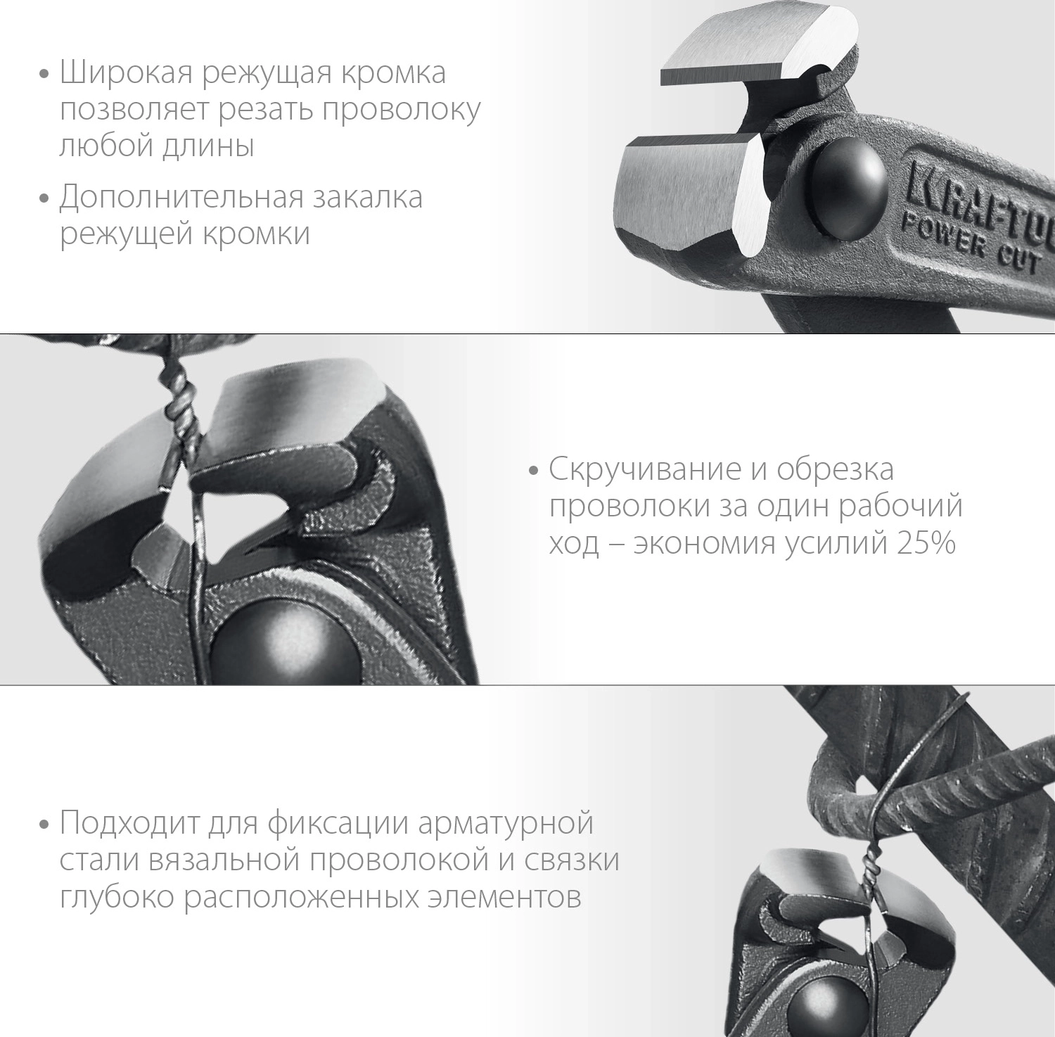 - Широкая режущая кромка позволяет резать проволоку любой длины