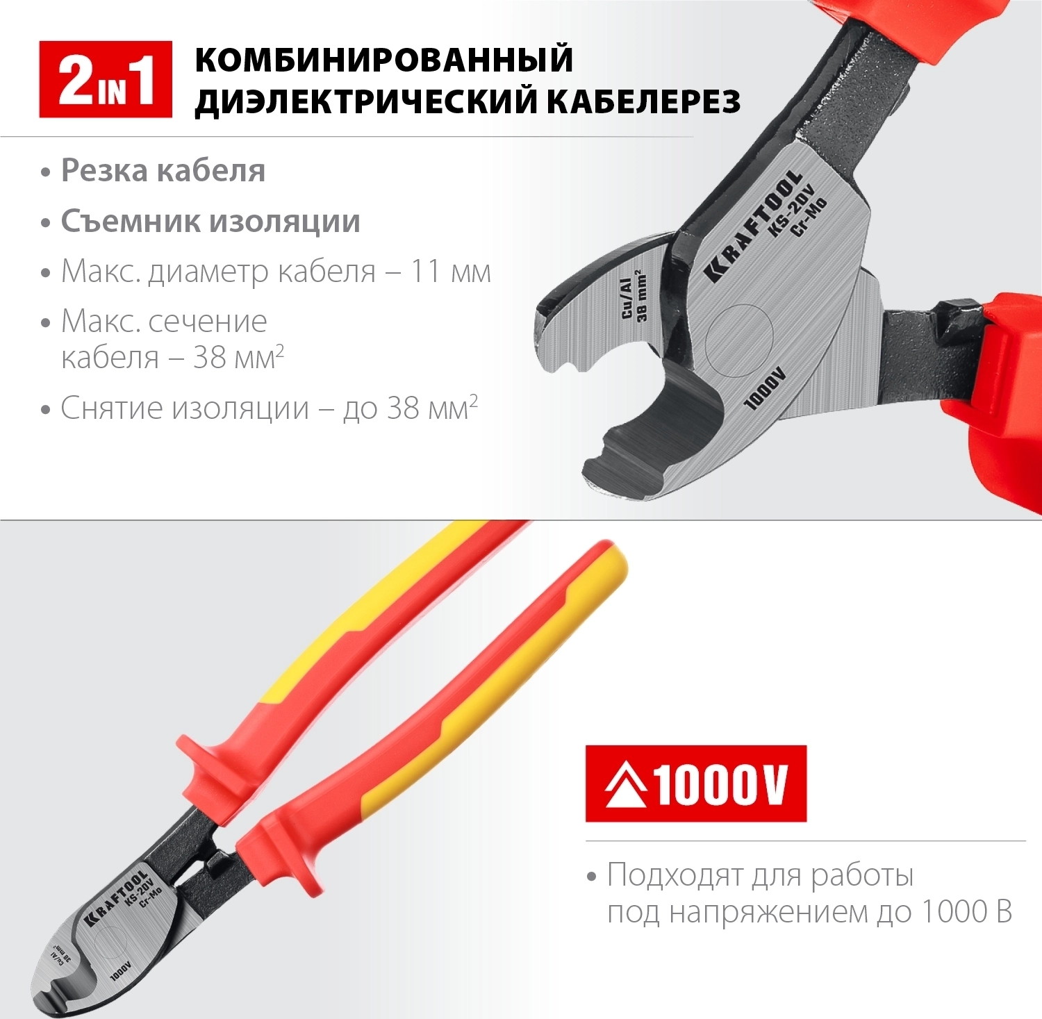 Профессиональный электромонтажный инструмент KRAFTOOL изготовлен из высококачественной стали и предназначен для работ под напряжением до 1000 В, использовать для перекусывания гибких проводников, изготовленных только из цветных металлов