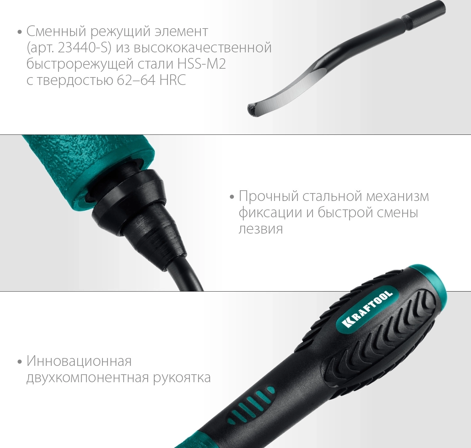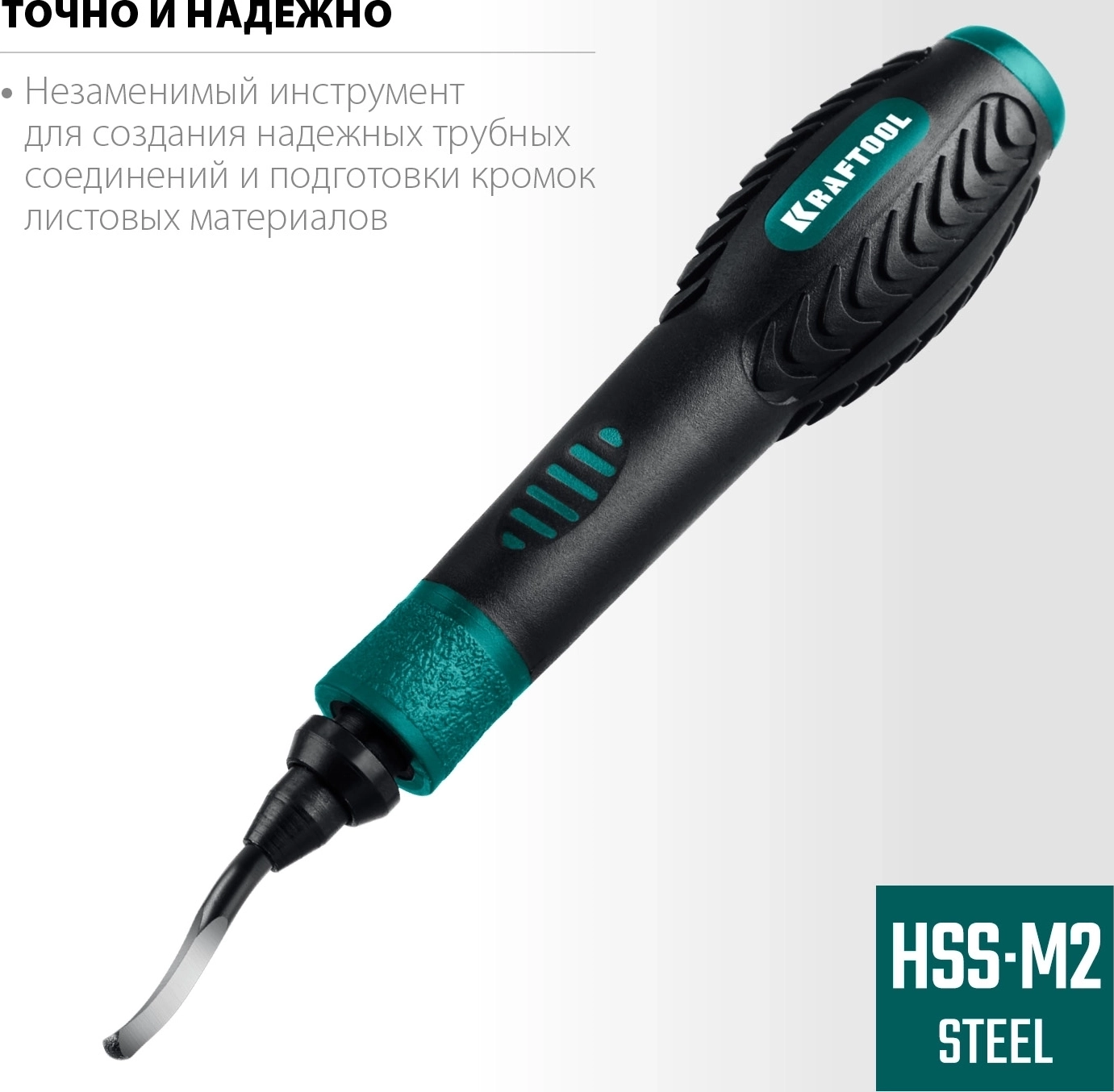 Гратосниматель KRAFTOOL – профессинальный инструмент, изготовленный на высокоточном оборудовании. Режущий элемент из легированной стали обеспечивает высокую точность снятия фаски и сохраняет режущую способность в течение продолжительного срока службы, что обеспечивает высокую надежность трубных соединений.