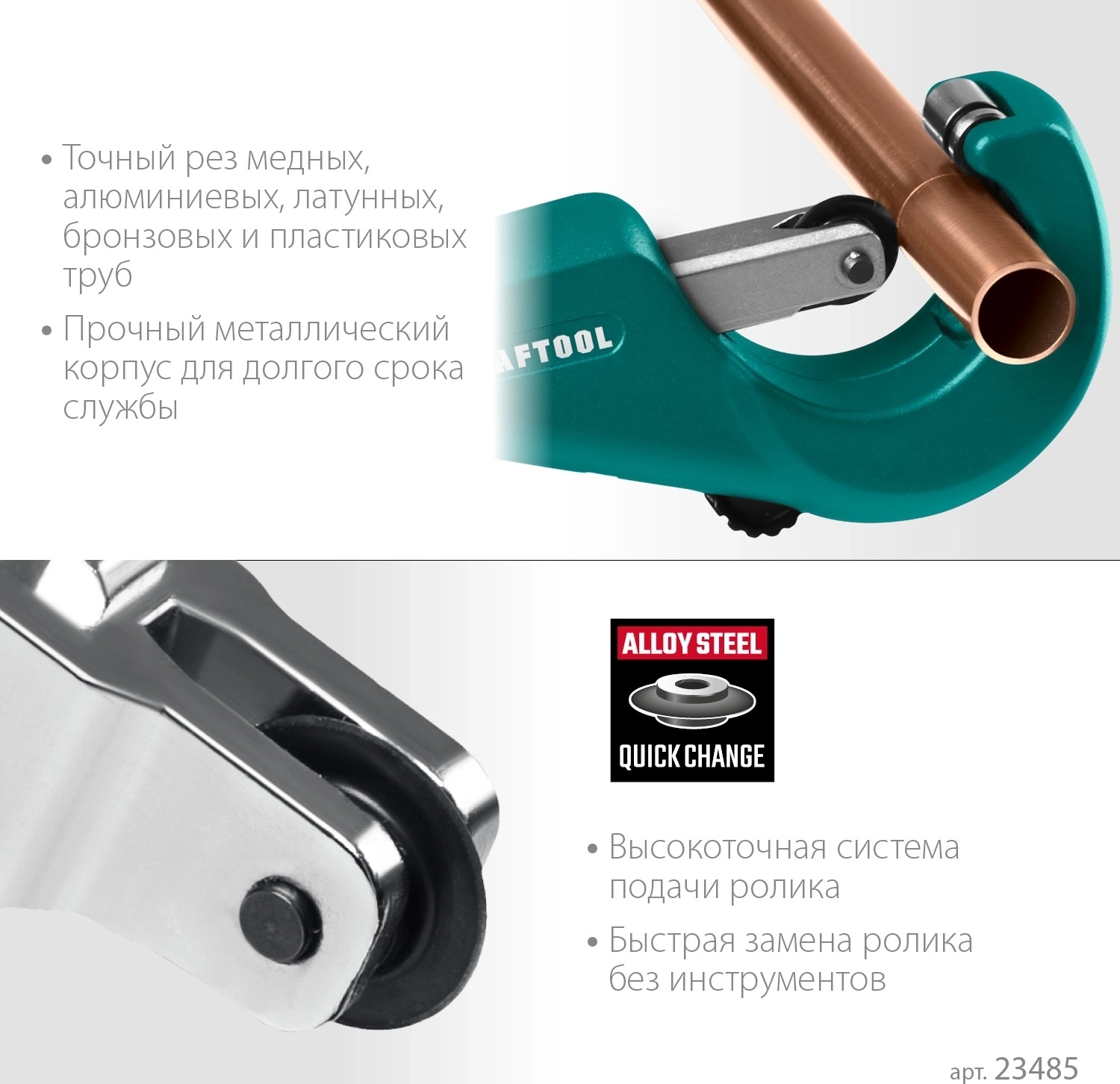 Труборезы Kraftool разработаны в соответствии с высокими требованиями профессионалов. Режущие элементы, изготовленные из легированной стали высшего качества, обеспечивают высокую режущую способность в течение продолжительного срока службы . Инновационная система крепления обеспечивает быструю и легкую смену режущего элемента, комфортную и эффективную работу.
