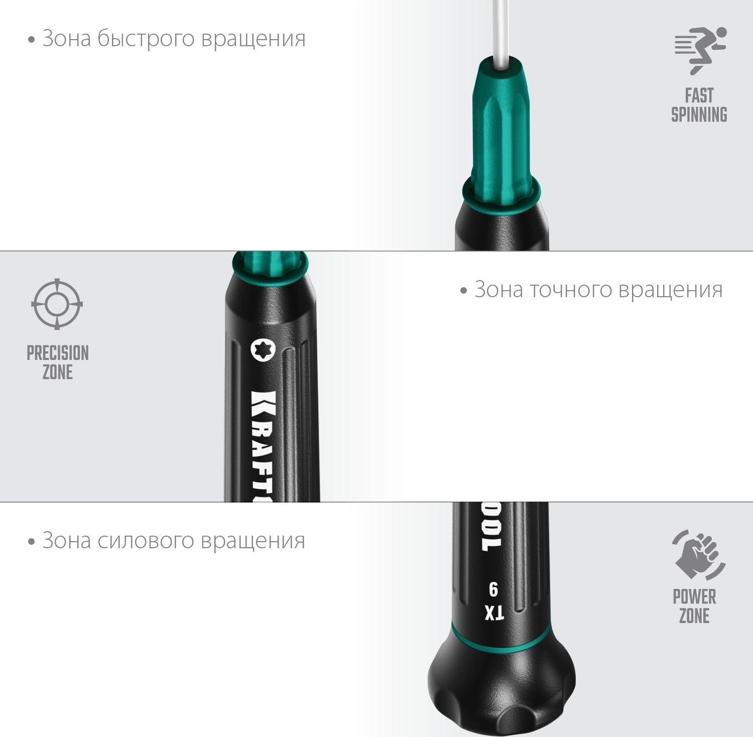 - Три зоны вращения: быстрая, точная, силовая