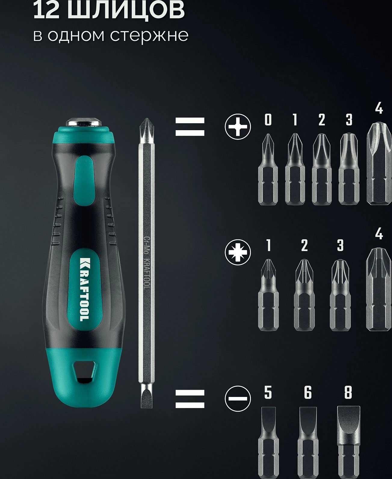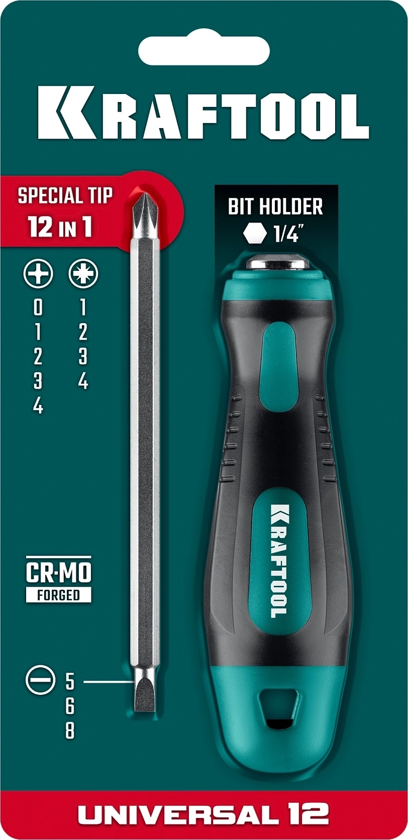 Универсальная переставная отвертка с двусторонним стержнем KRAFTOOL Universal-12, PH 0-1-2-3-4, PZ 1-2-3-4, SL 5, 6, 8 мм, 12-в-1