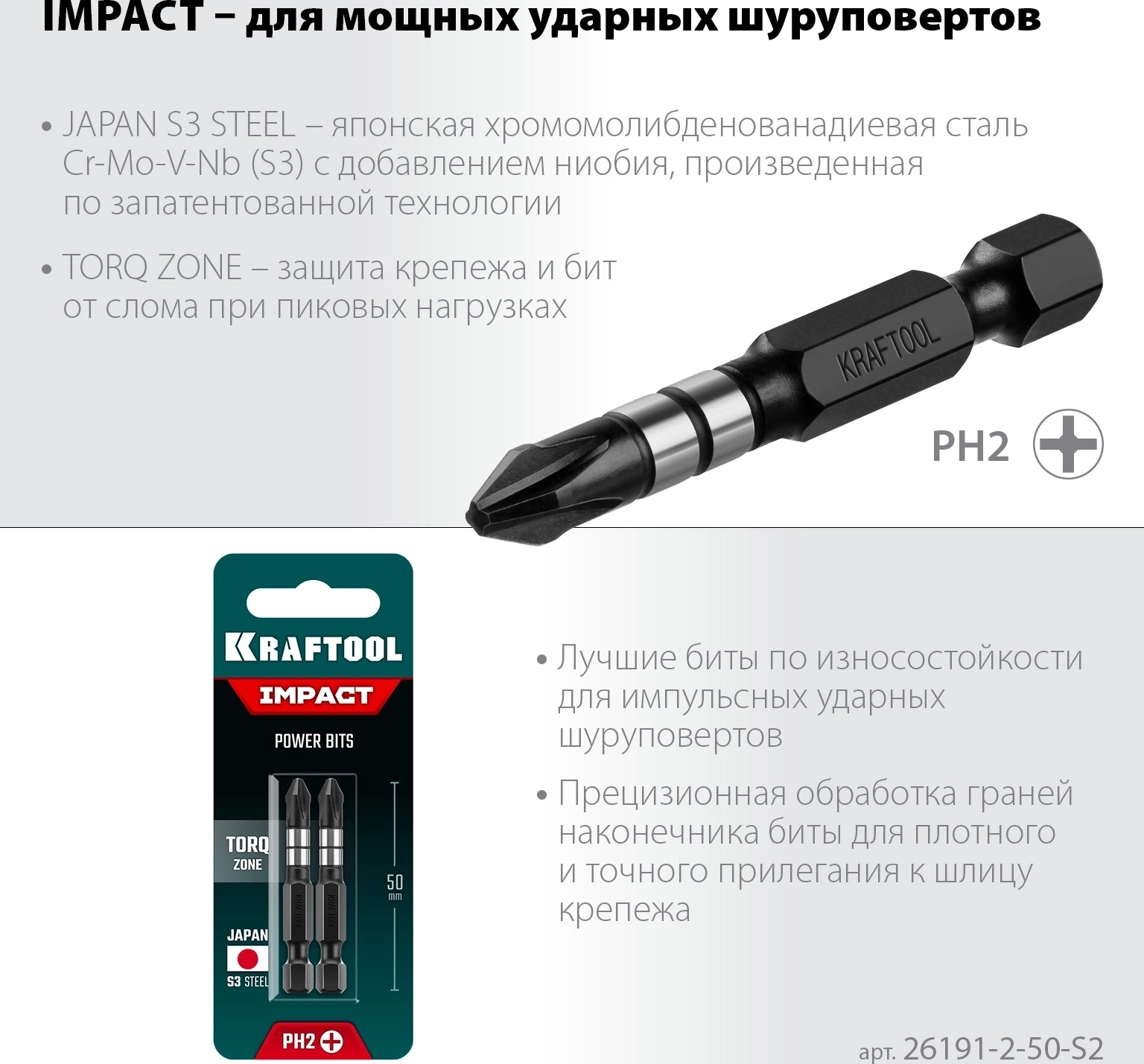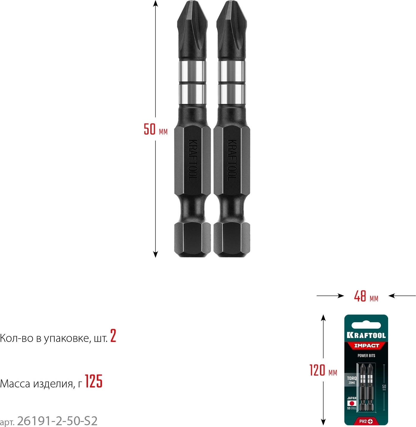 Ударные биты KRAFTOOL Impact PH2, 50 мм, 2 шт
