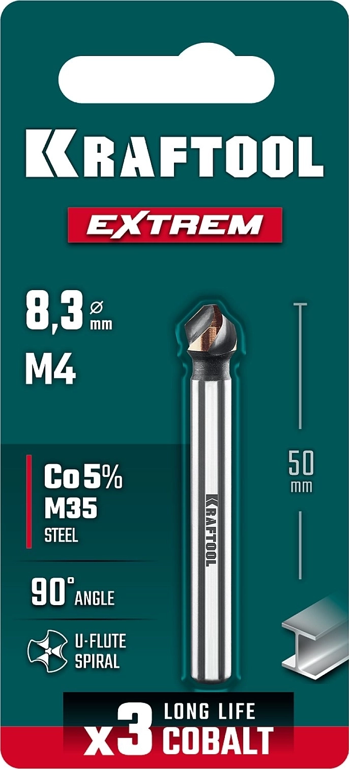 Конусный зенкер KRAFTOOL EXTREME Со5-А, d 8.3 х 50 мм, сталь M35, U-образная спираль, для раззенковки М4
