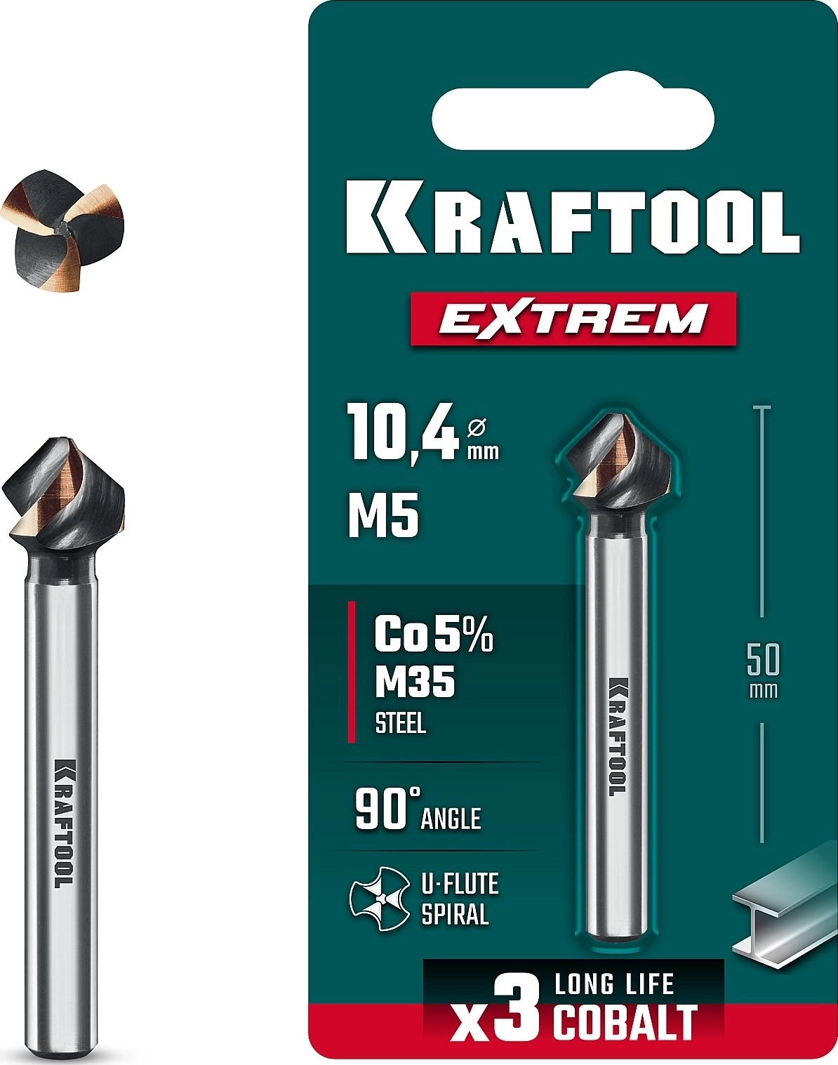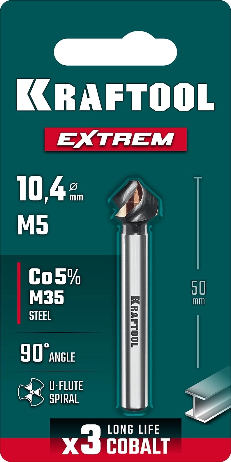 Конусный зенкер KRAFTOOL EXTREME Со5-А, d 10.4 х 50 мм, сталь M35, U-образная спираль, для раззенковки М5