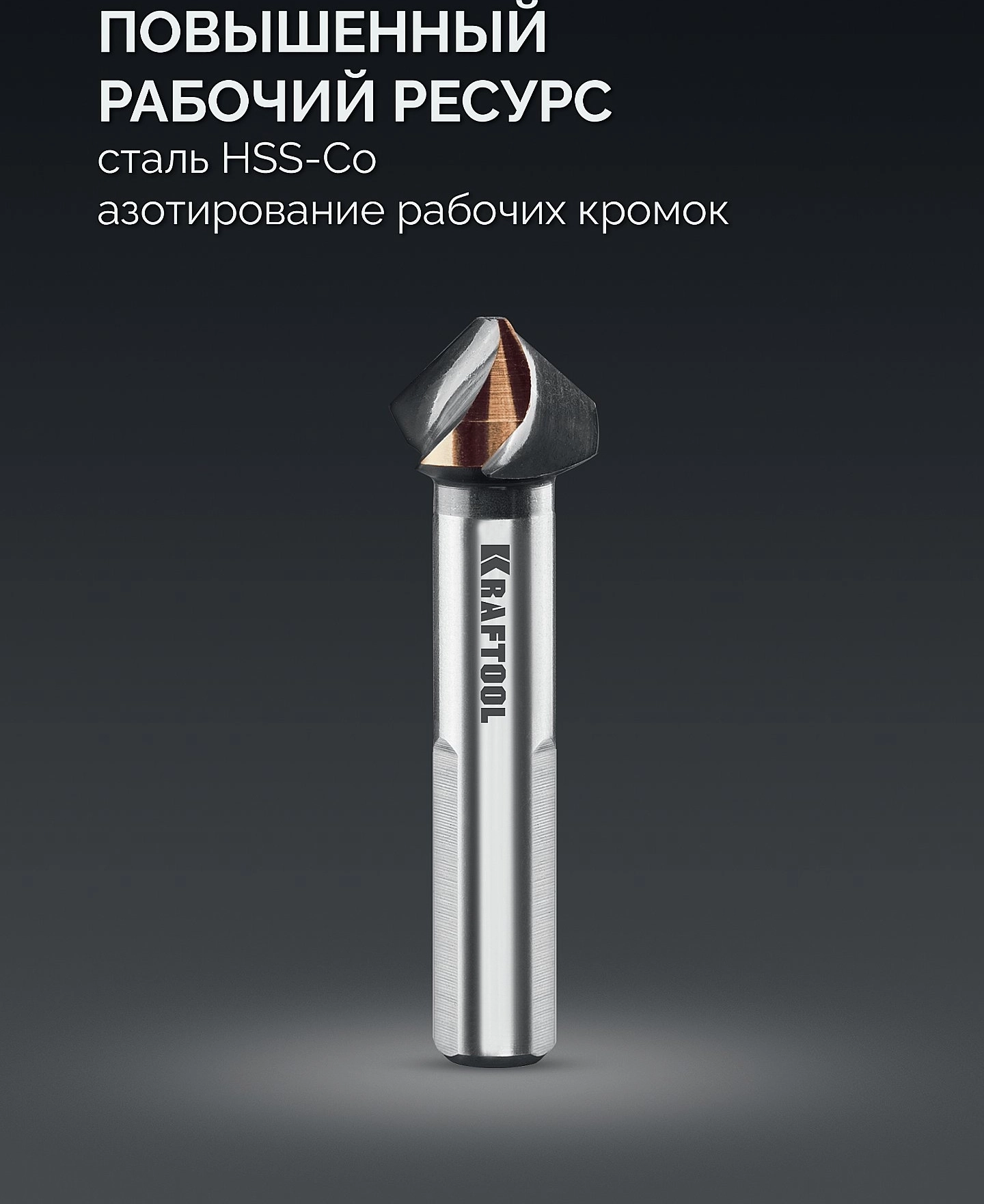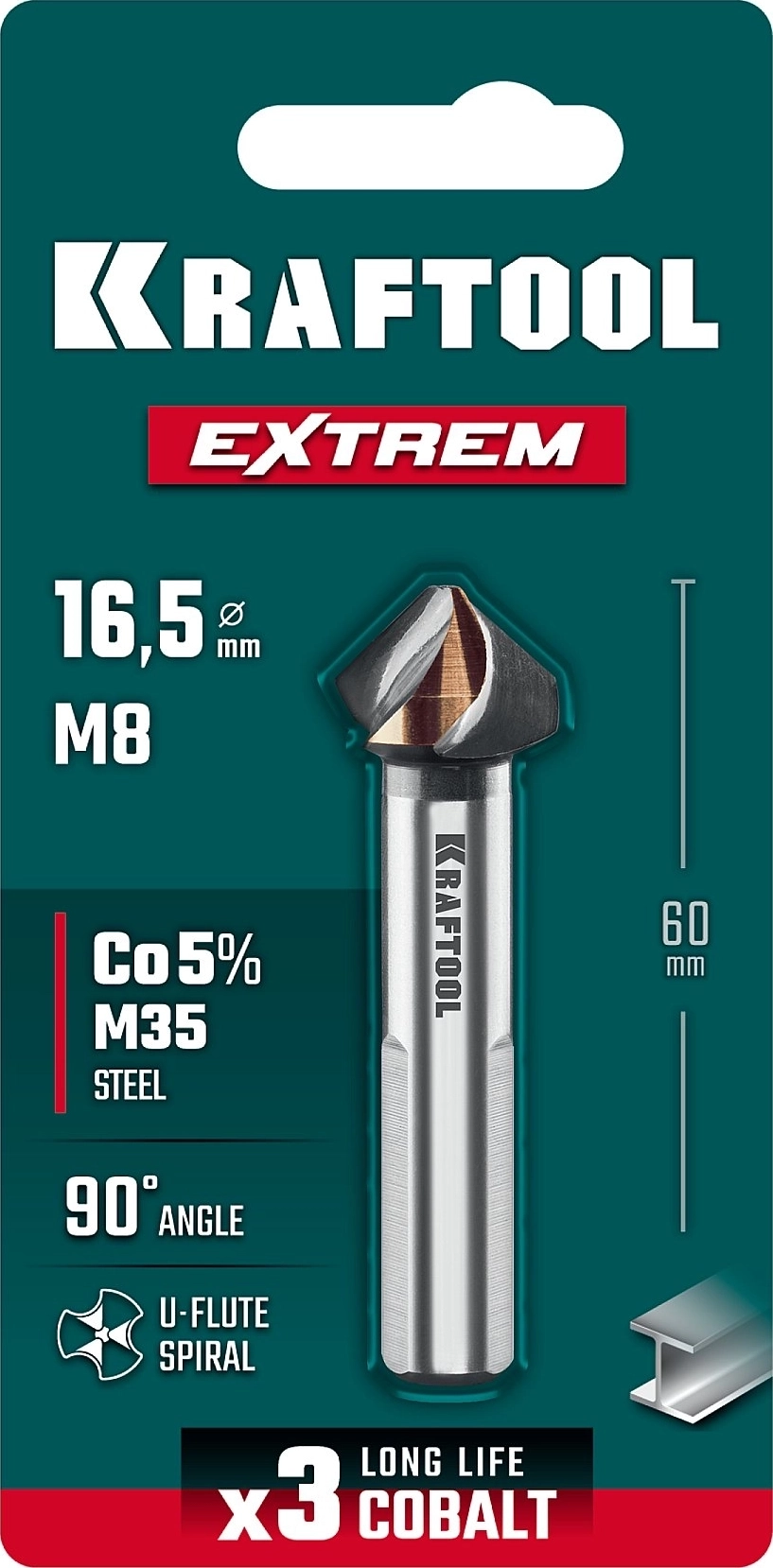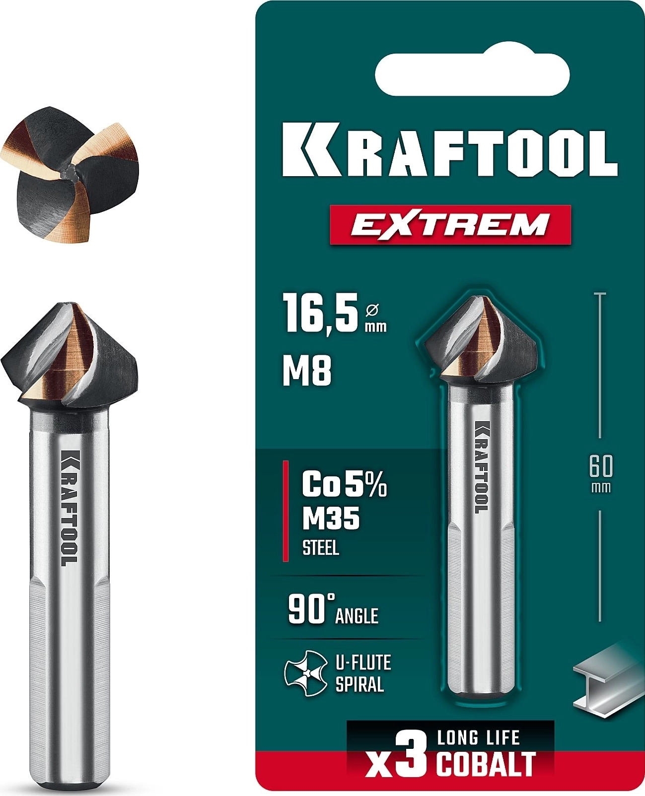 Конусный зенкер KRAFTOOL EXTREME Со5-А, d 16.5 х 60 мм, сталь M35, U-образная спираль, для раззенковки М8
