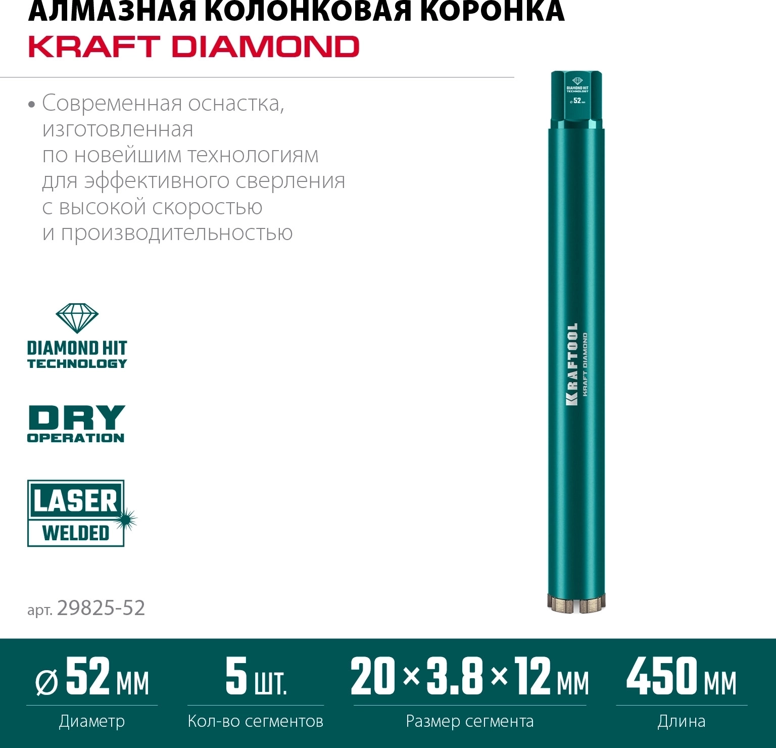 Алмазная Коронка по железобетону KRAFTOOL DIAMOND 52 мм (450 мм, 1 1/4″, лазерная сварка сегментов)