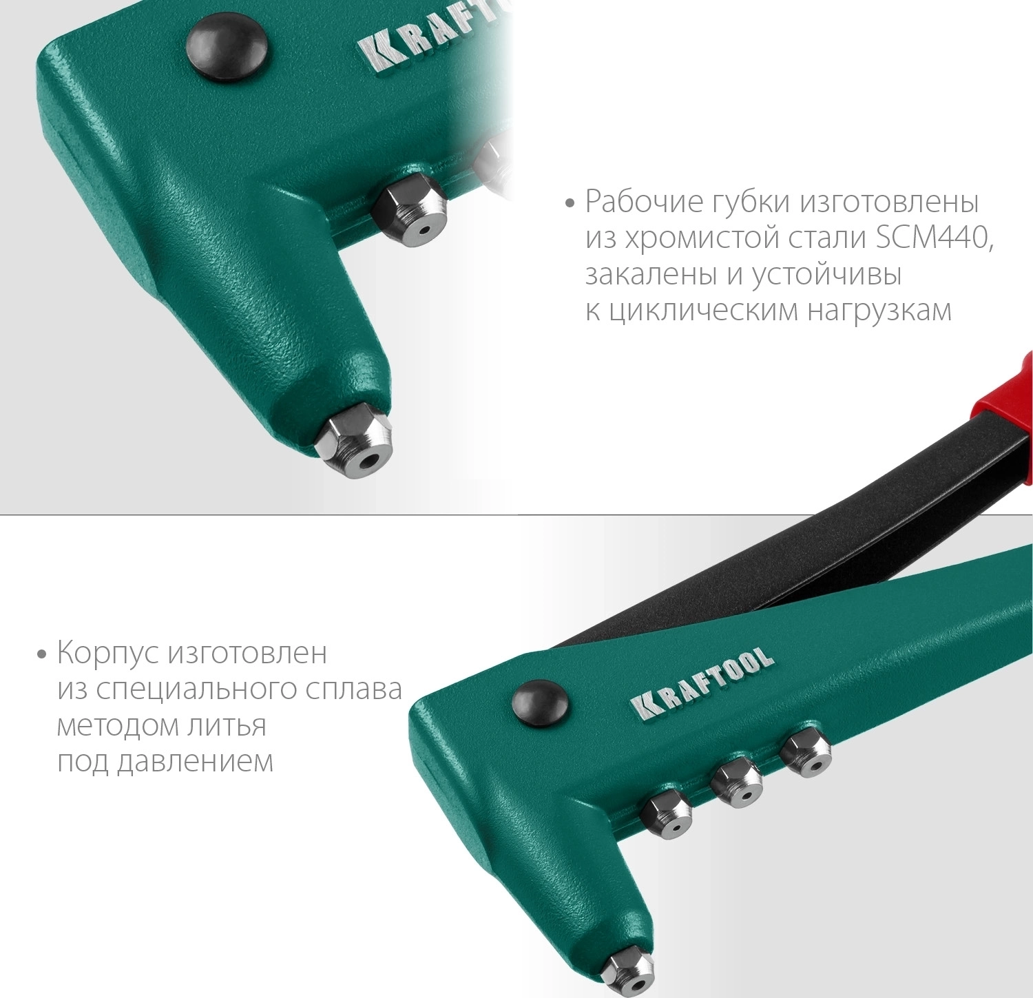 Заклепочник KRAFTOOL выдерживает высокие рабочие нагрузки и предназначен для установки заклепок из алюминия, стали и нержавеющей стали различных диаметров согласно таблице.