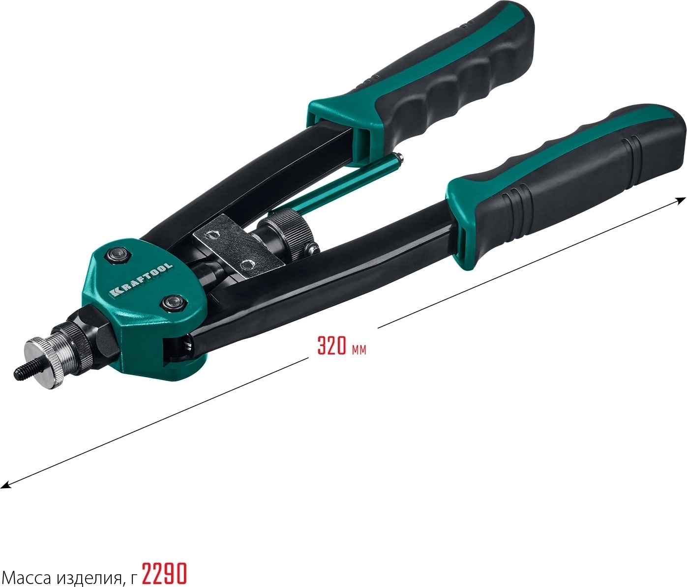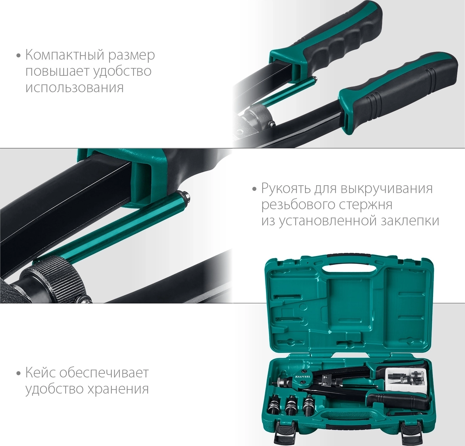Двуручный резьбовой заклепочник KRAFTOOL выдерживает высокие рабочие нагрузки и предназначен для установки резьбовых заклепок из алюминия, стали и нержавеющей стали.