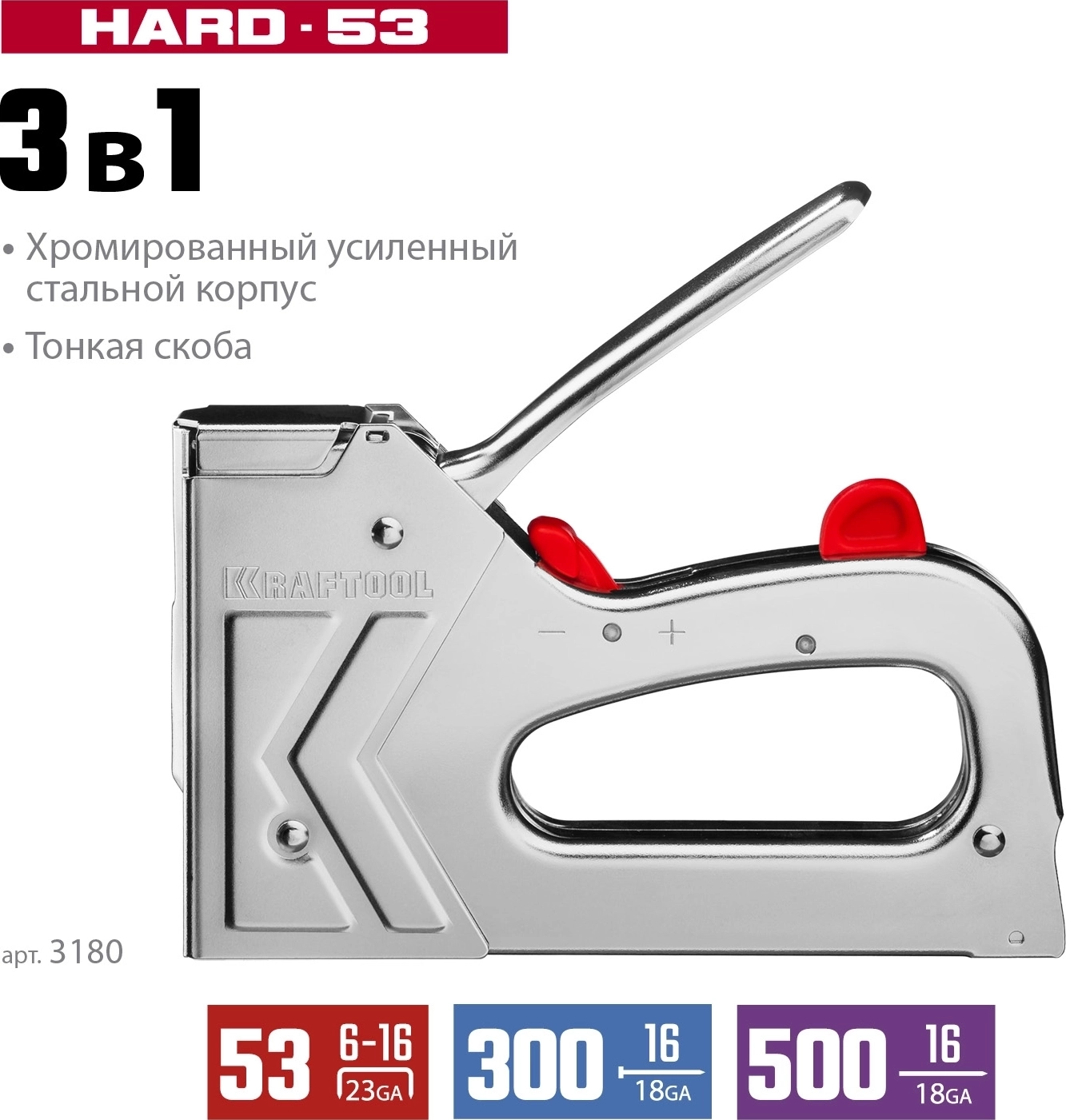 Тип скобы, гейдж и возможные аналоги других производителей: 53 3в1: 53 (6-16 мм) 23GA / 300 (16 мм) 18GA / 500 (16 мм) 18GA