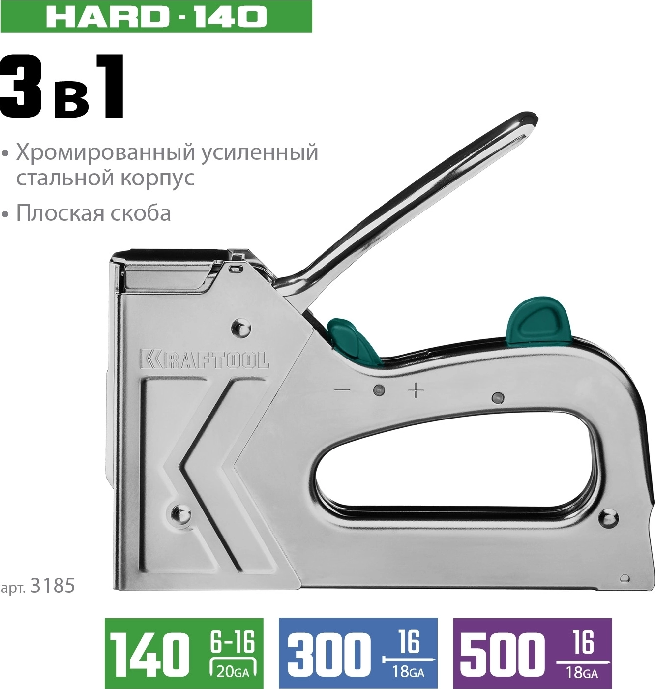 Тип скобы, гейдж и возможные аналоги других производителей: 140 3в1: 140 (6-16 мм) 20GA / 300 (16 мм) 18GA / 500 (16 мм) 18GA