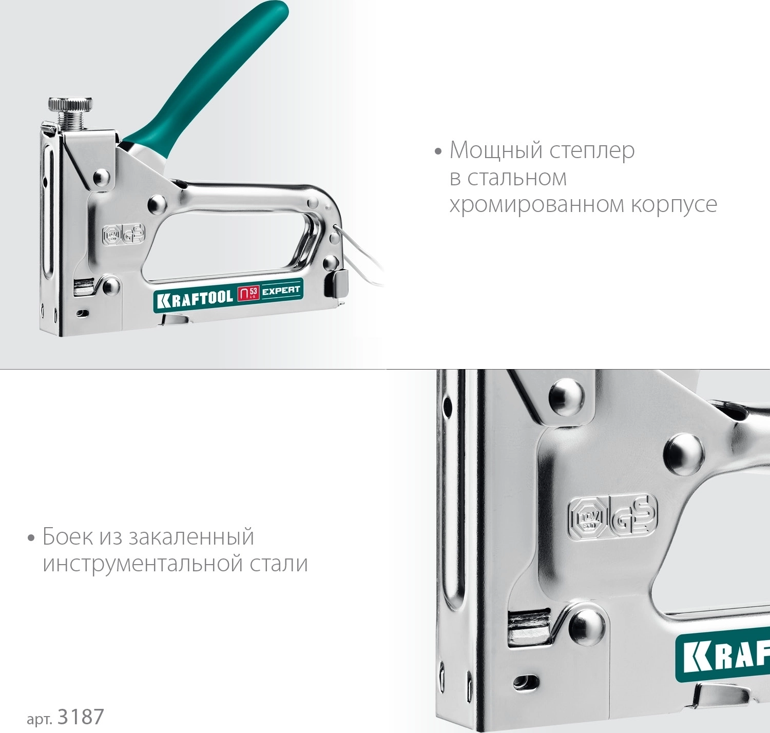 Профессиональный cтеплер. Увеличенное отверстие для хвата, противоскользящая рукоятка. Плавная регулировка силы удара. Стальной хромированный корпус. Пружина и боек из закалённой стали.