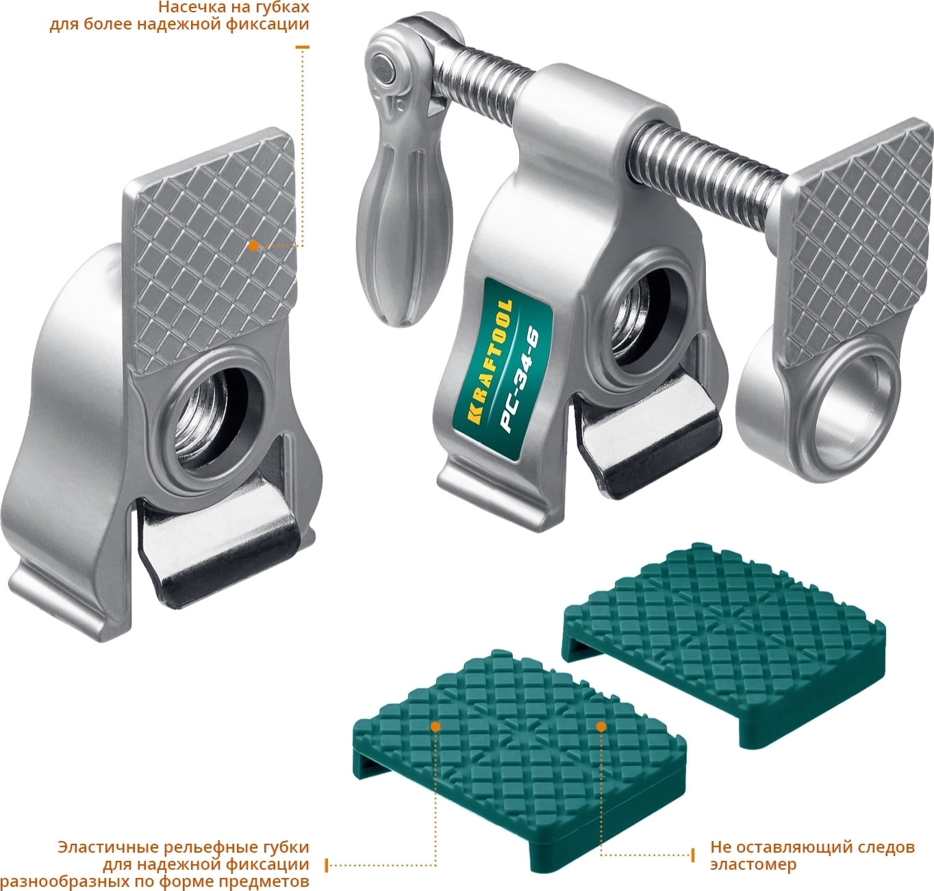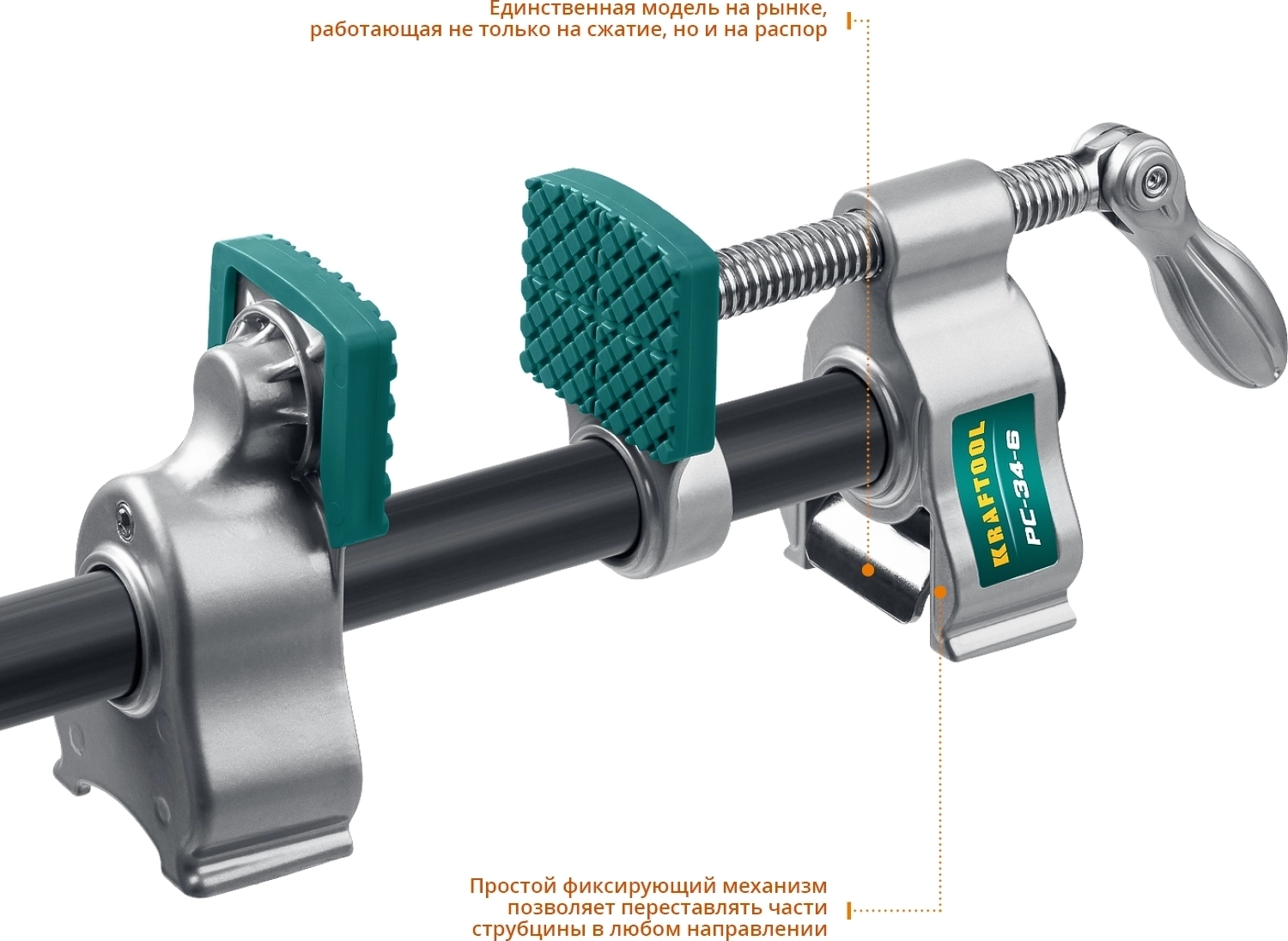 Трубная струбцина KRAFTOOL PC-34-6 с неограниченной шириной захвата - надежный зажимной/распорный инструмент. Удобная рычажно-поворотная рукоятка, широкие ножки в основании, мягкие накладки на губки - обеспечивают максимальный комфорт при выполении работ. Усилие - до 600 кгс.