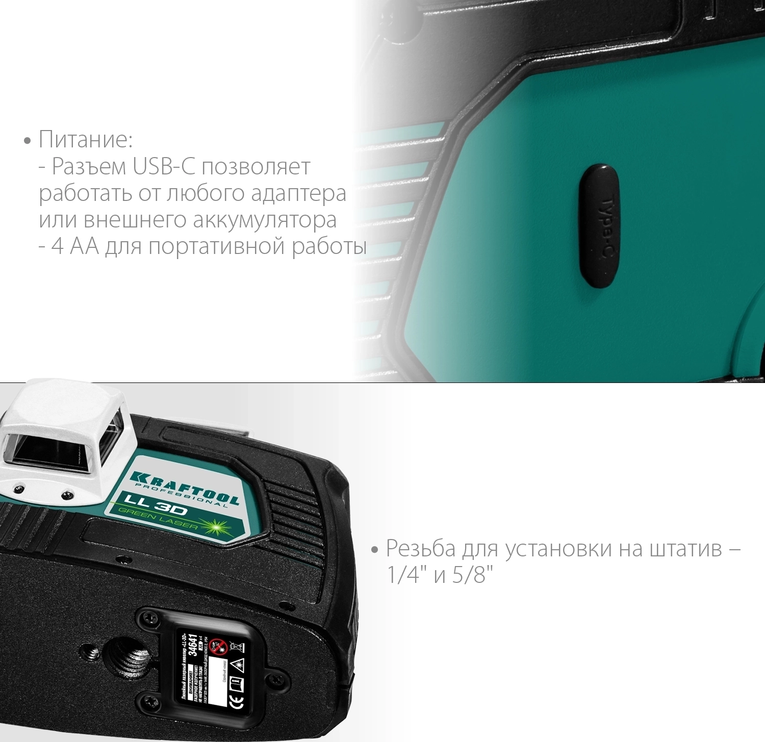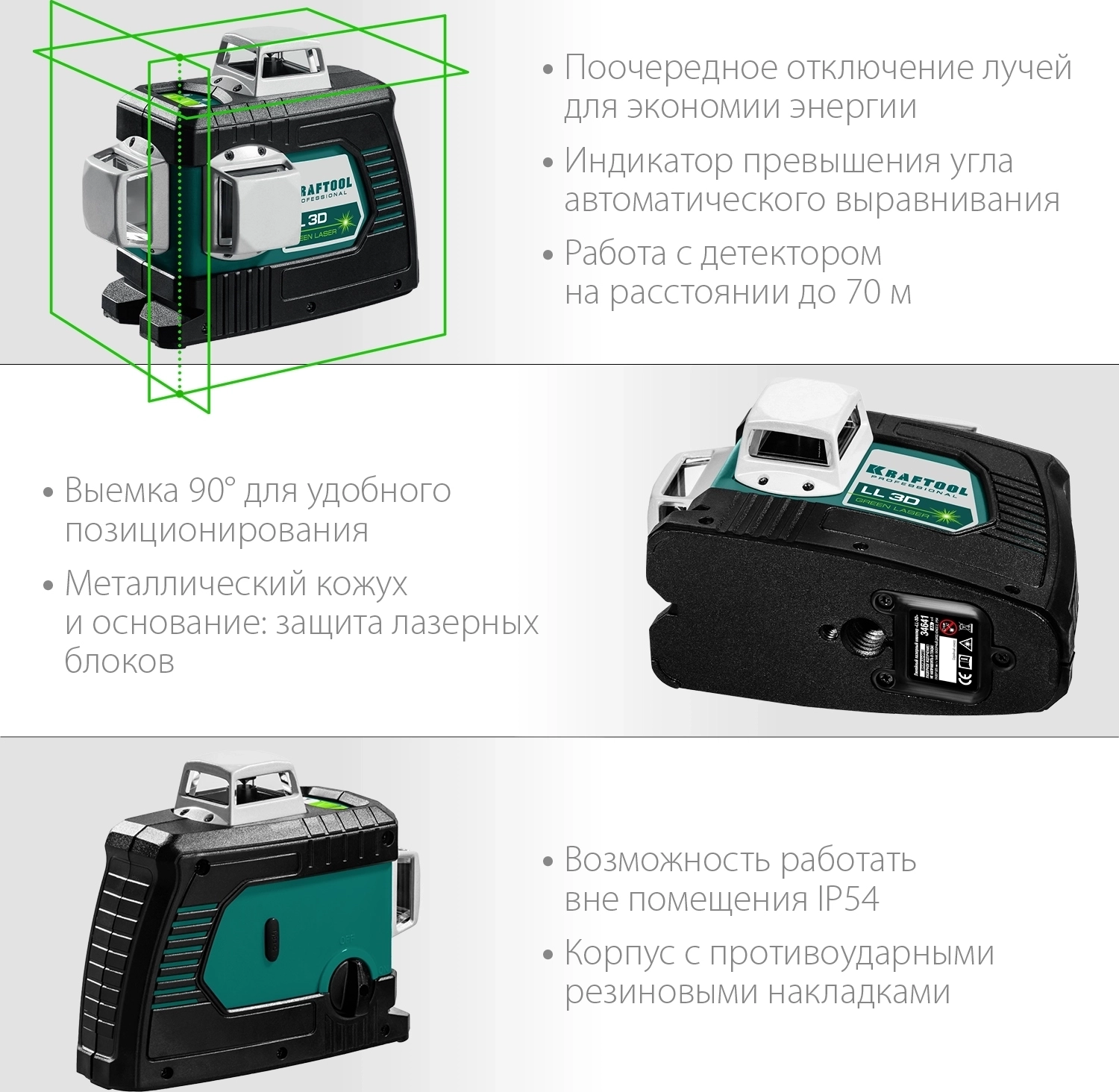 - 3 режима проецирования линий: горизонтальная и две вертикальные линии с развёрткой 360°, благодаря чему луч будет виден в любой точке.