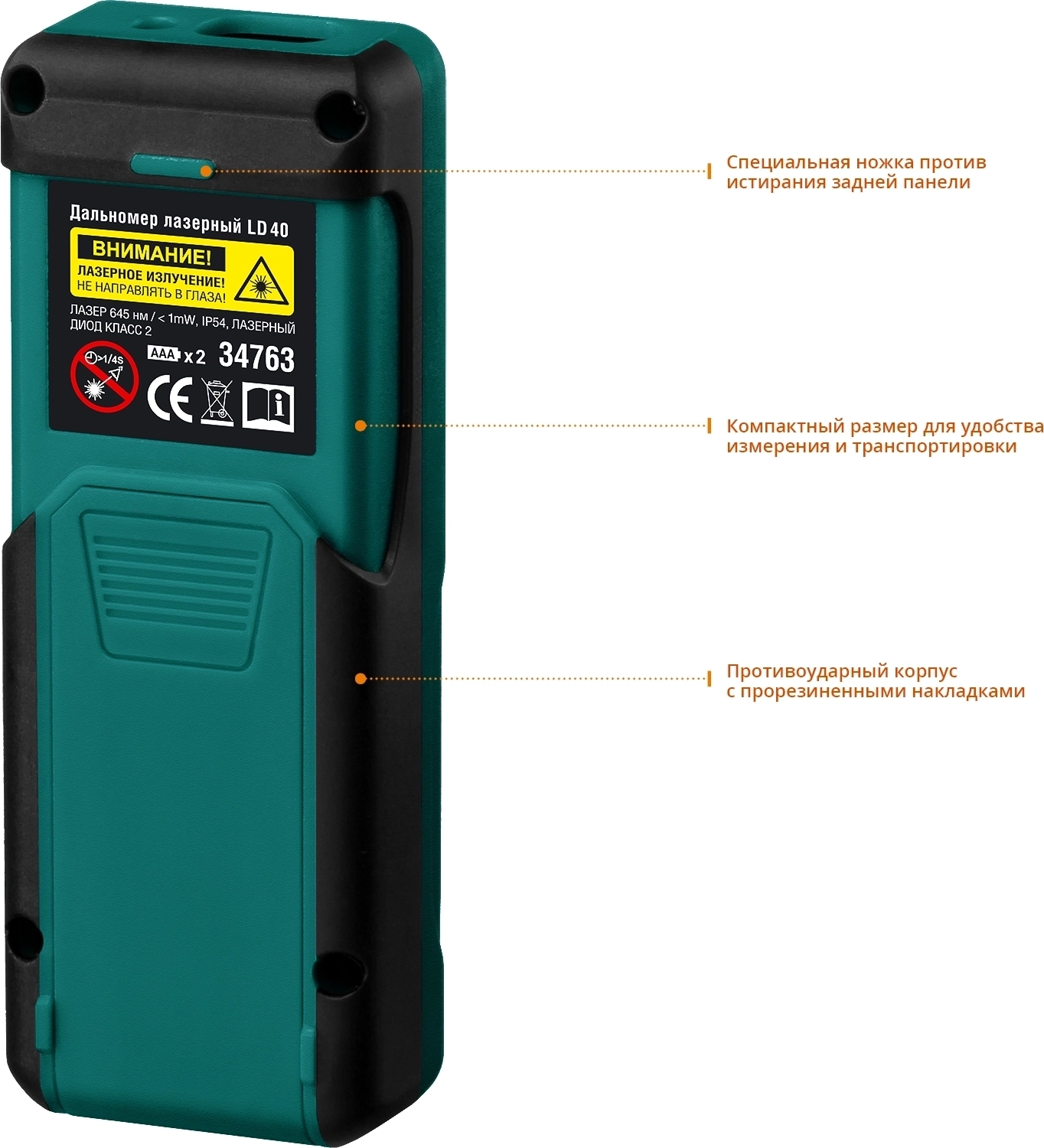 - Инновационная конструкция лазерного модуля и приёмника луча обеспечивает возможность проведения измерений на улице с возможностью надёжного покрытия до 50% от заявленного диапазона