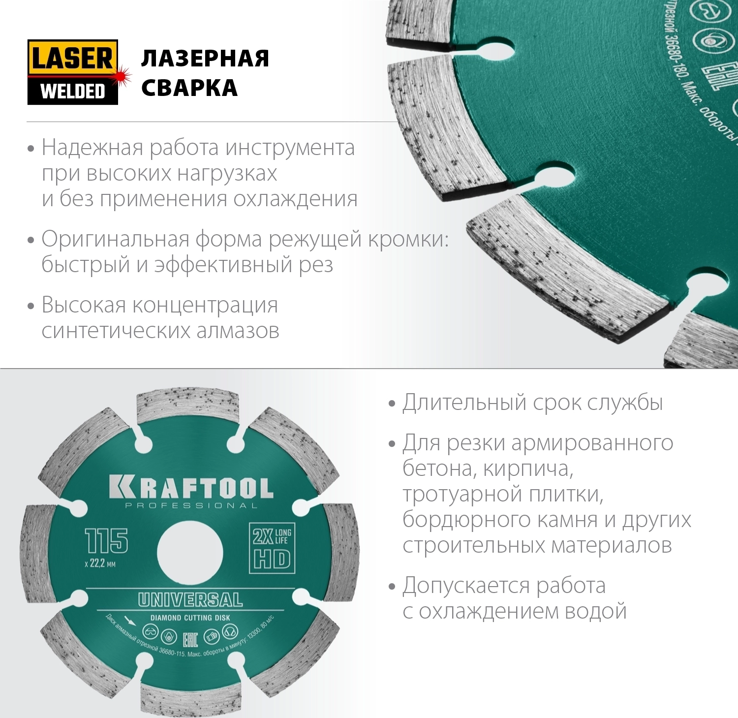 Алмазный диск KRAFTOOL LASER-UNIVERSAL 115 мм (22.2 мм, 10х2.2мм)