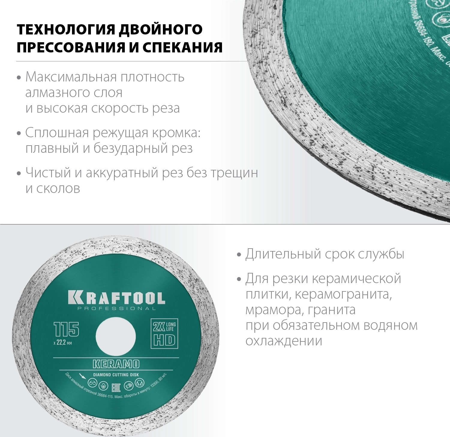 Сплошной алмазный диск KRAFTOOL KERAMO, 115 мм, (22.2 мм, 10 х 1.6 мм)
