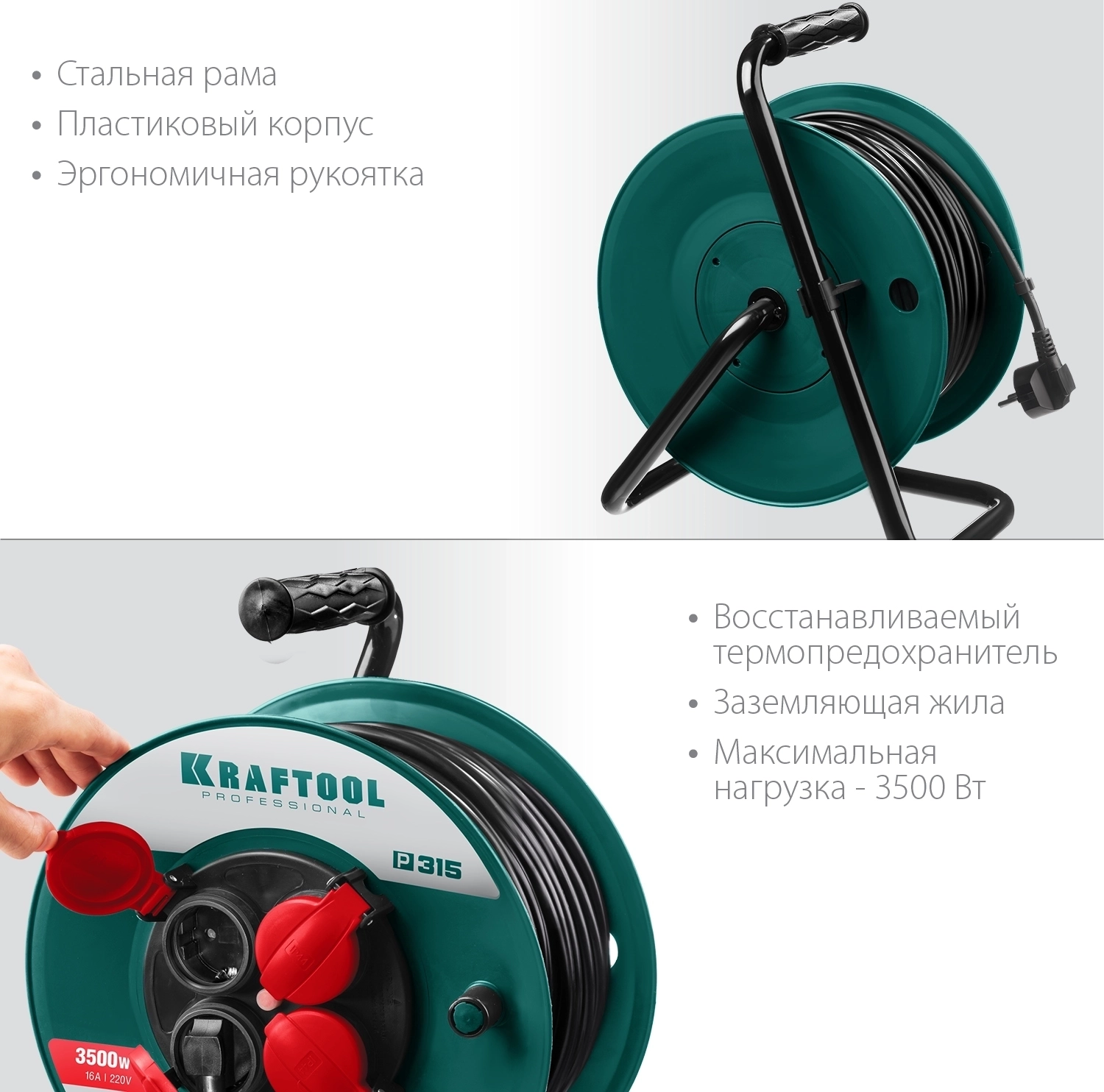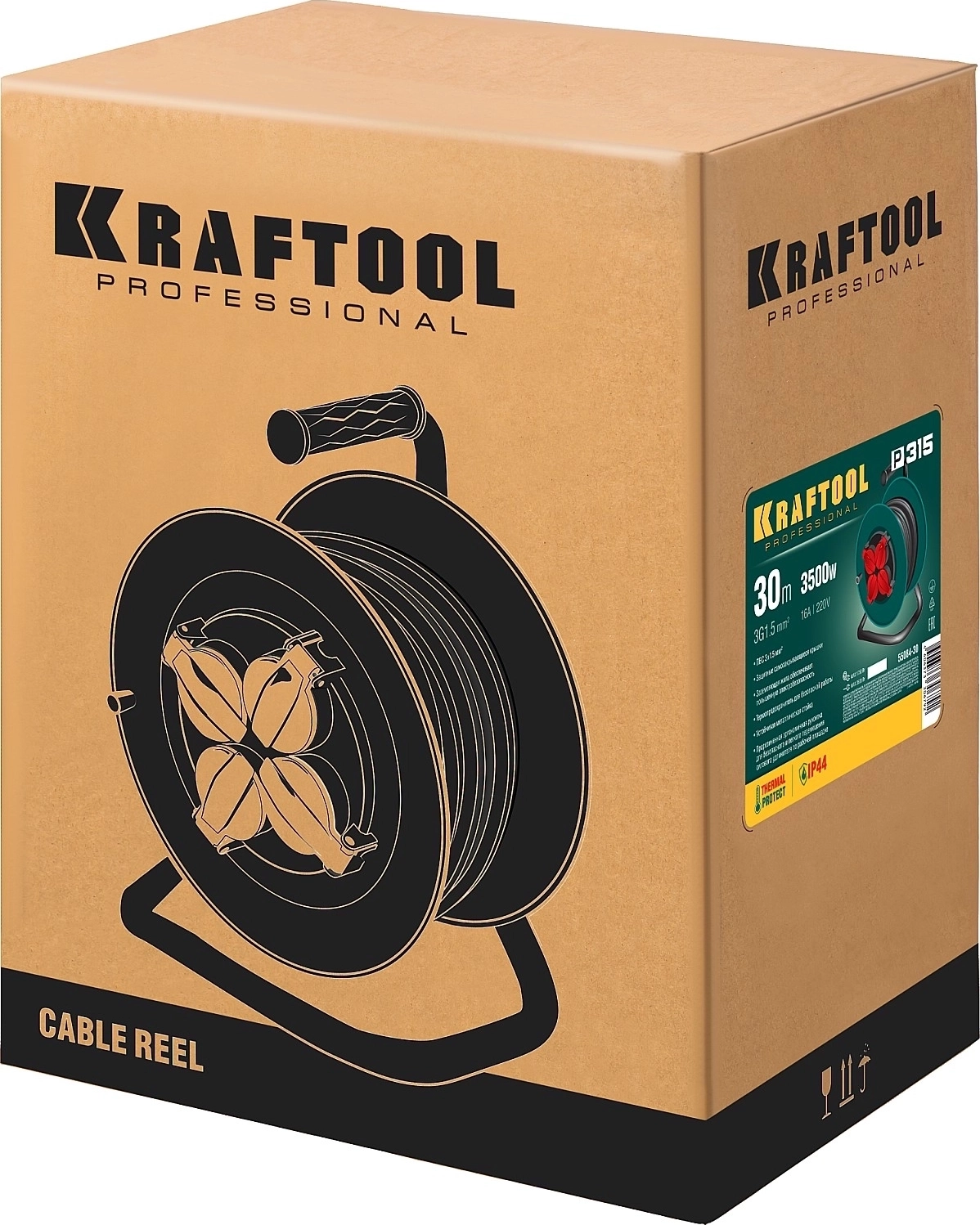 Силовой удлинитель на катушке KRAFTOOL P-315, ПВС, 3 x 1.5 мм2, 30 м, 3500 Вт, IP44