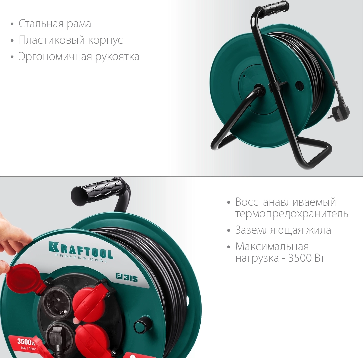 Силовой удлинитель на катушке KRAFTOOL P-315, ПВС, 3 x 1.5 мм2, 50 м, 3500 Вт, IP44