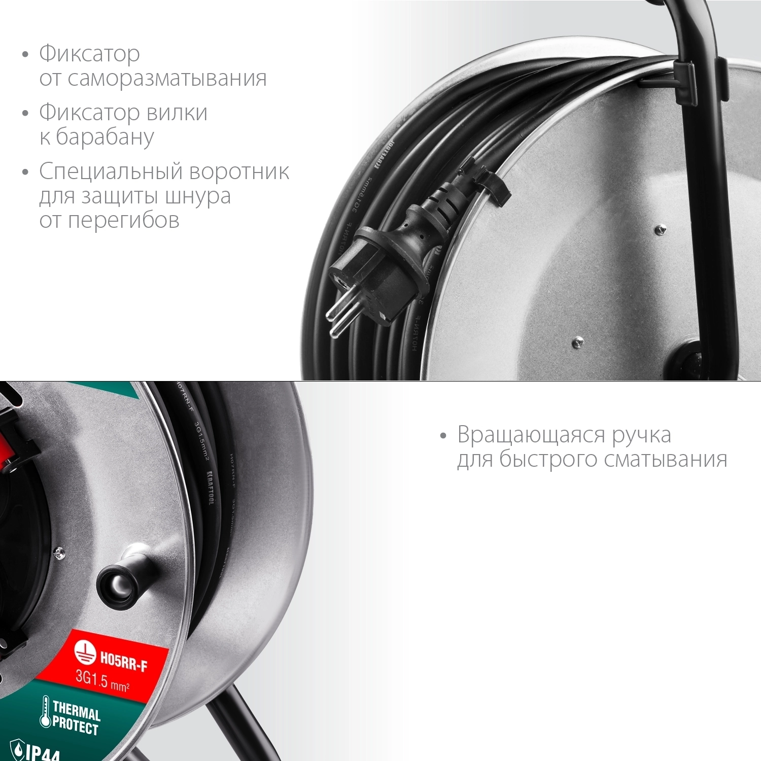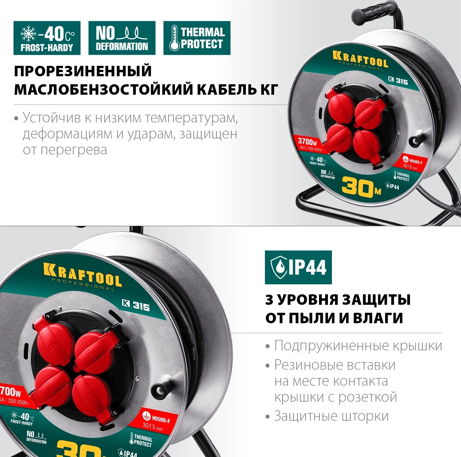 Силовой удлинитель на стальной катушке KRAFTOOL K-315, КГ, 3 x 1.5 мм2, 30 м, 3700 Вт, IP44