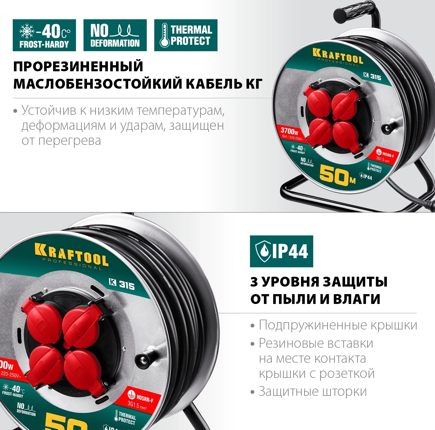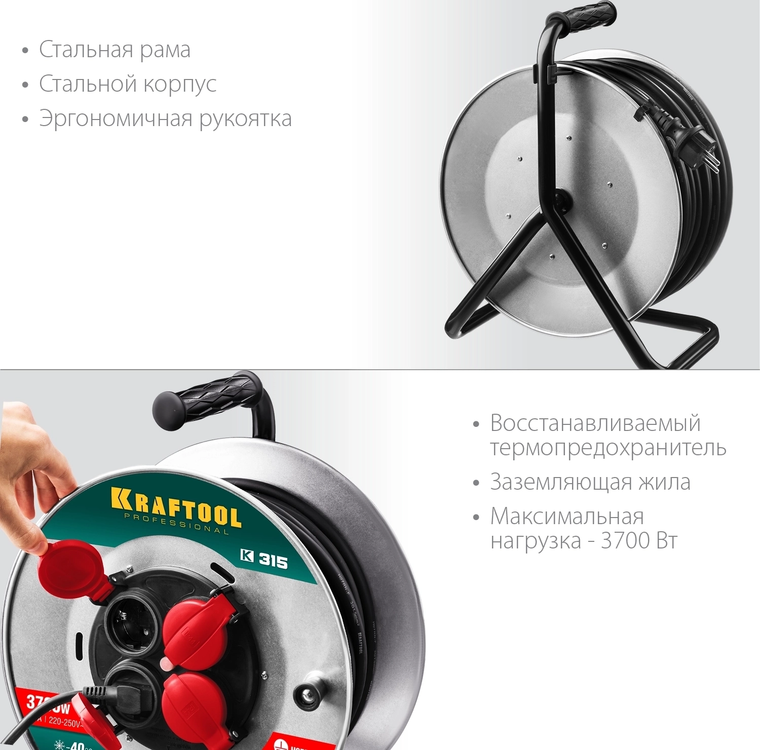 Силовой удлинитель на стальной катушке KRAFTOOL K-315, КГ, 3 x 1.5 мм2, 50 м, 3700 Вт, IP44